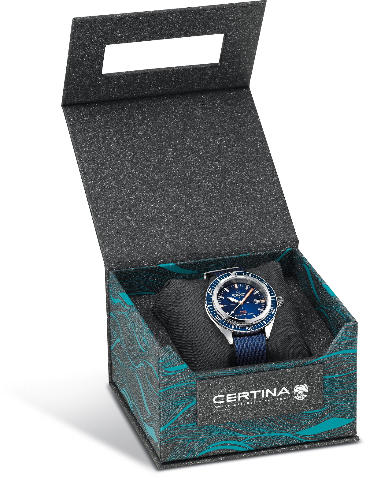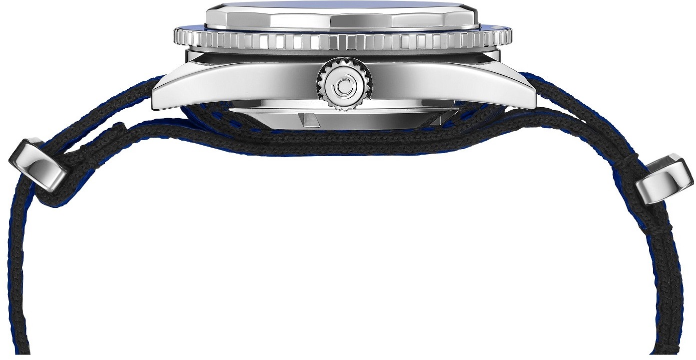 Certina DS Super PH500M C037.407.18.040.10 to męski zegarek automatyczny na niebiesko-czarnym pasku NATO ze sprzączką. Koperta ze szczotkowanej i polerowanej stali nierdzewnej ma średnicę 43 milimetrów, jednokierunkowo obracający się bezel z aluminiową wstawką ze skalą do nurkowania oraz dekiel oznaczony logo Sea Turtle Conservancy, z którym ta specjalna edycja był przygotowany. Niebieska tarcza ze szlifem słonecznym i wskazaniem daty jest podzielona liniami na sektory i zabezpieczona trwałym szkłem szafirowym z warstwą antyrefleksyjną. Indeksy godzinowe wraz ze wskazówkami i częścią lunety pokryte są powłoką luminescencyjną Super-LumiNova®, która gwarantuje doskonałą czytelność w warunkach słabego oświetlenia. Zegarek napędzany jest mechanizmem Powermatic 80.611 z naciągiem automatycznym i rezerwą chodu wynoszącą około 80 godzin. Kaliber jest wyposażony w koło zamachowe Nivachron™, które jest specjalnym materiałem antymagnetycznym, dzięki któremu zegarek jest wysoce odporny na pola magnetyczne. Mechanizm ten z funkcją hakowania można w razie potrzeby nakręcić także ręcznie za pomocą zakręcanej koronki. W modelu zastosowano technologięDS (Double Security), stosowaną i doskonaloną od 1959 roku, dzięki której zegarek ma zwiększoną odporność na uderzenia i wodę. Wodoodporność zegarka wynosi 50 ATM, a dzięki certyfikatowi ISO 6425 jest to odpowiedni wybór do nurkowania według wskazań przyrządów.