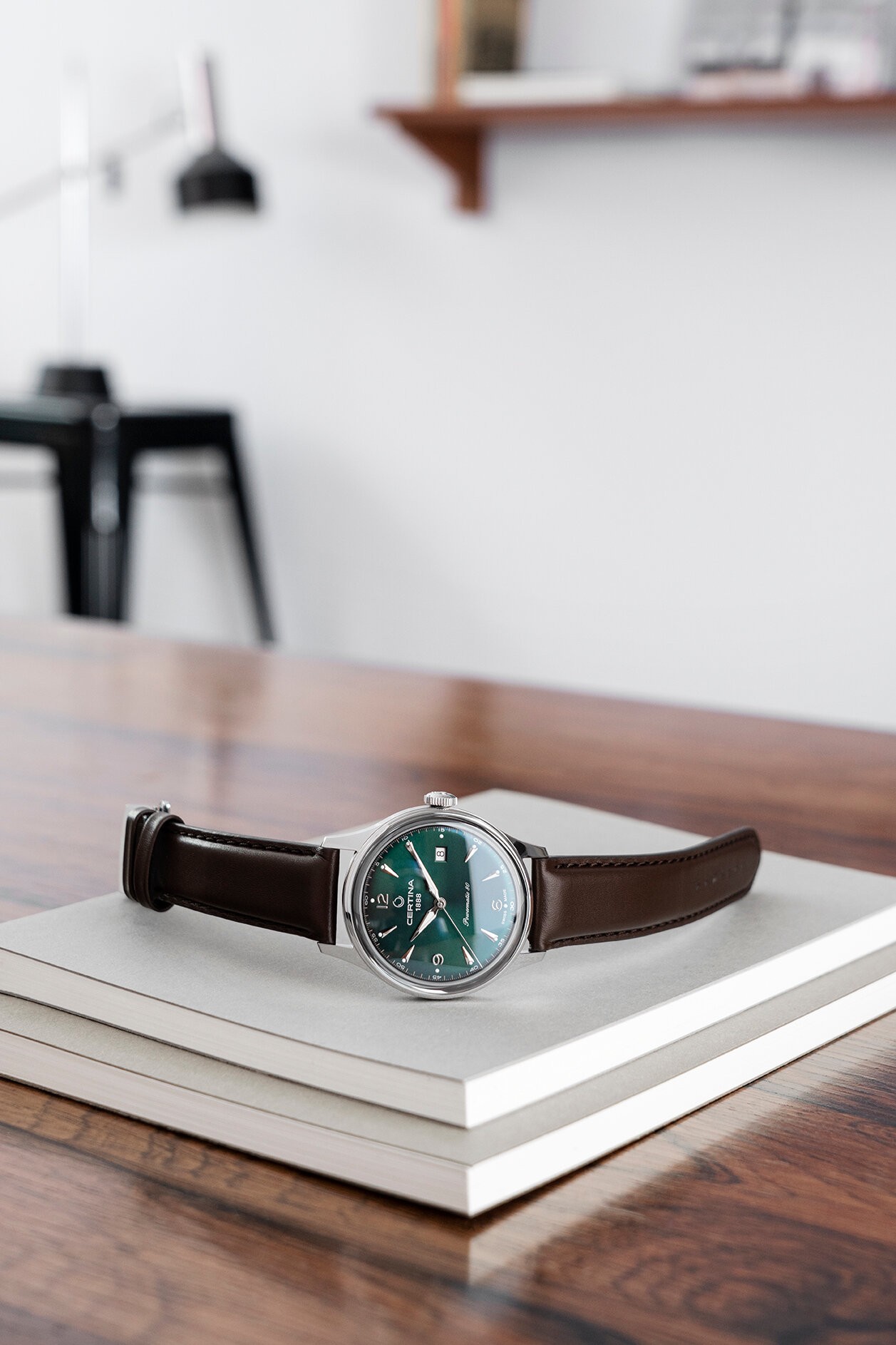 Certina DS Powermatic 80 C038.407.16.097.00 to męski zegarek automatyczny na brązowym skórzanym pasku z zapięciem motylkowym. Koperta ze stali nierdzewnej ma średnicę 41 milimetrów i przezroczysty dekiel. Zielona tarcza ze szlifem słonecznym i datownikiem jest chroniona wypukłym szkłem szafirowym z powłoką antyrefleksyjną. Zastosowane indeksy godzinowe wraz ze wskazówkami pokryte są powłoką luminescencyjną Super-LumiNova®, która gwarantuje doskonałą czytelność w warunkach słabego oświetlenia. Zegarek napędzany jest mechanizmem Powermatic 80.611 z naciągiem automatycznym i rezerwą chodu wynoszącą około 80 godzin. Kaliber jest wyposażony w koło zamachowe Nivachron™, które jest specjalnym materiałem antymagnetycznym, dzięki któremu zegarek jest wysoce odporny na pola magnetyczne. Ten mechanizm z funkcją hakowania można w razie potrzeby nakręcić również ręcznie za pomocą sygnowanej koronki. W modelu zastosowano technologię DS (Double Security), stosowaną i doskonaloną od 1959 roku, dzięki której zegarek ma zwiększoną odporność na uderzenia i wodę. Wodoodporność zegarka wynosi 10 ATM i dlatego nadaje się do pływania i snorkelingu.