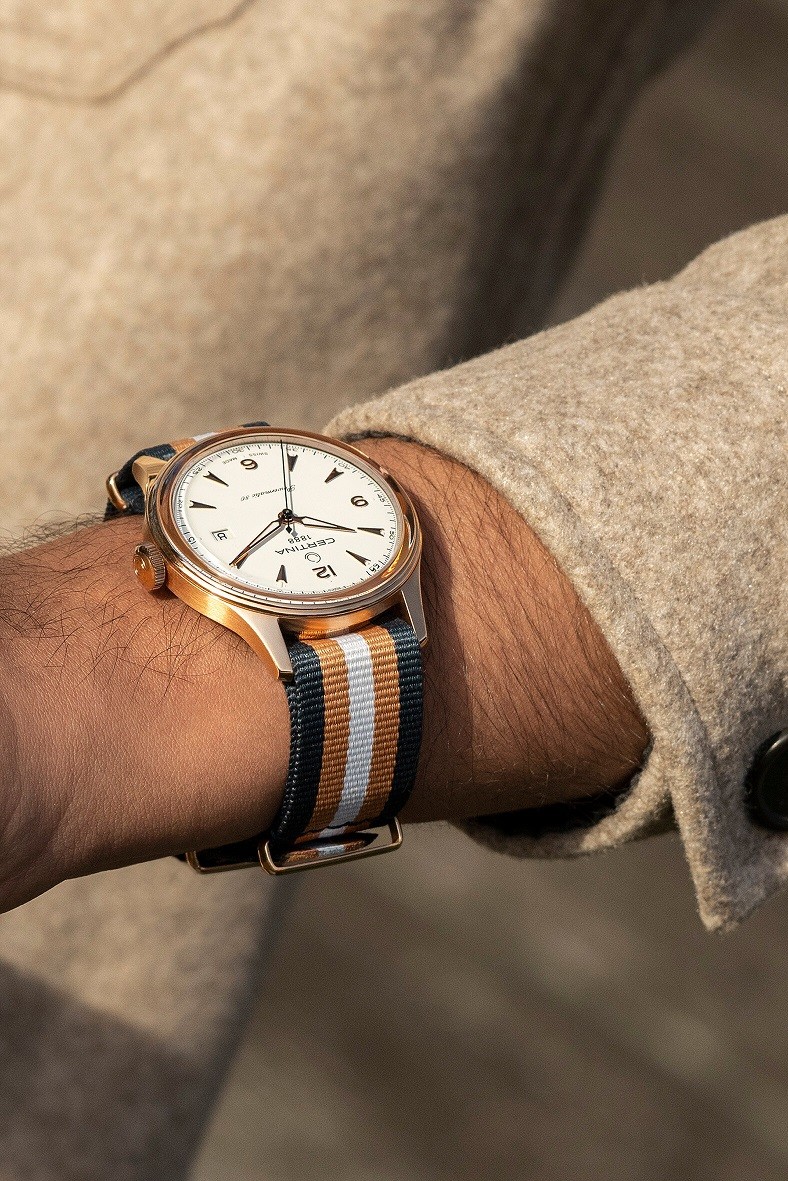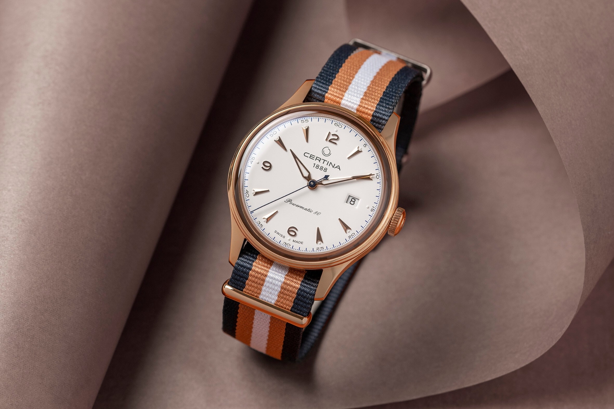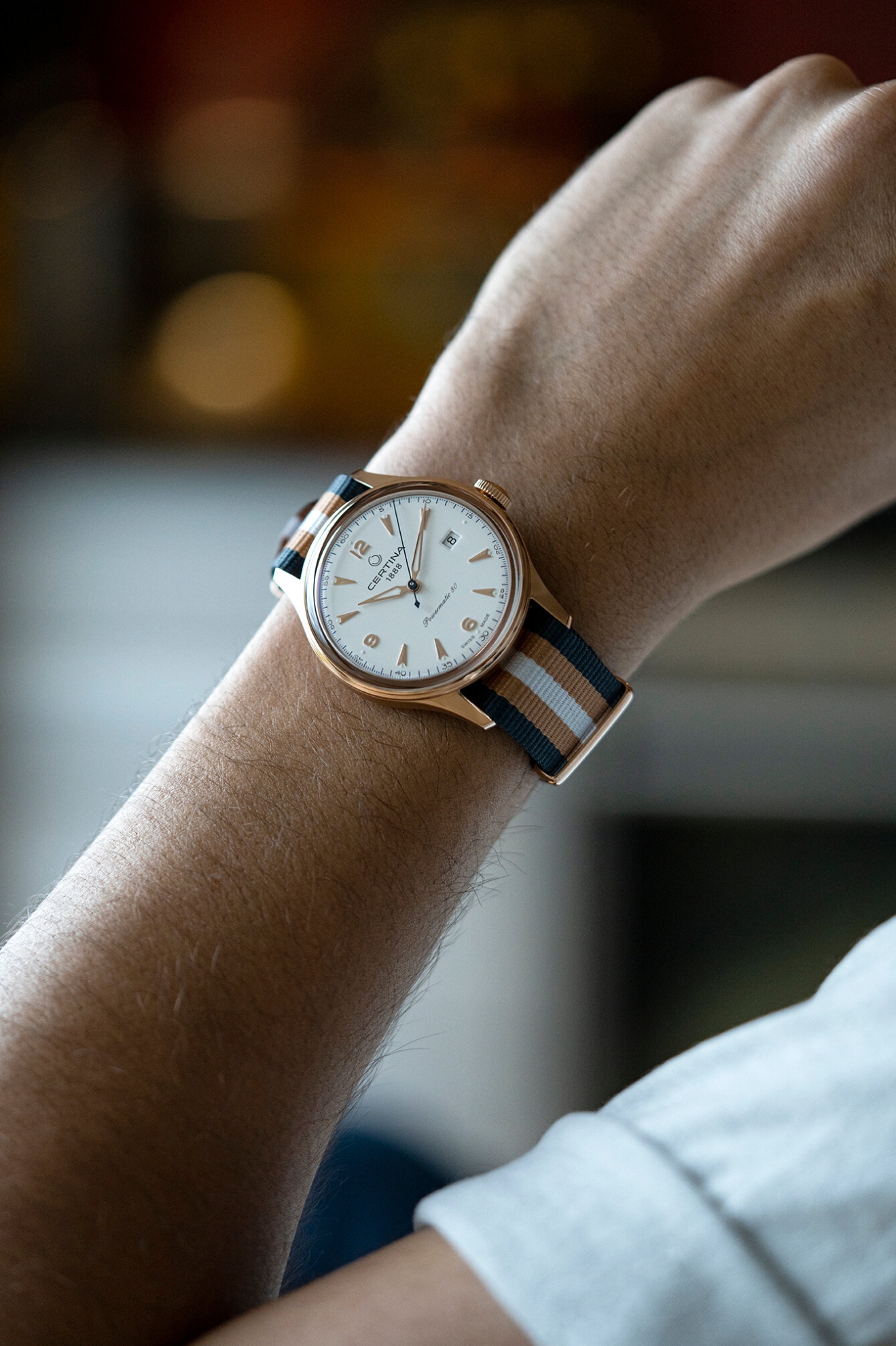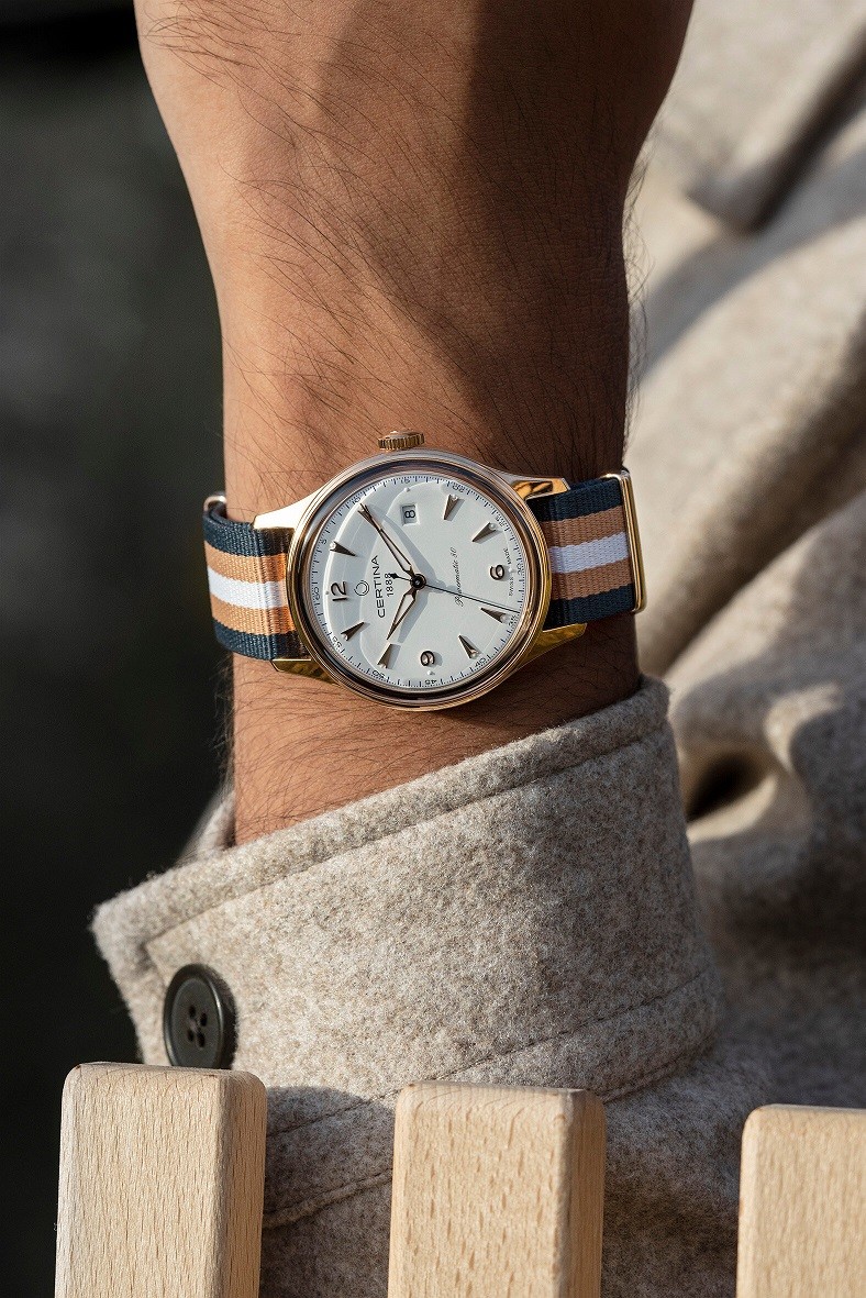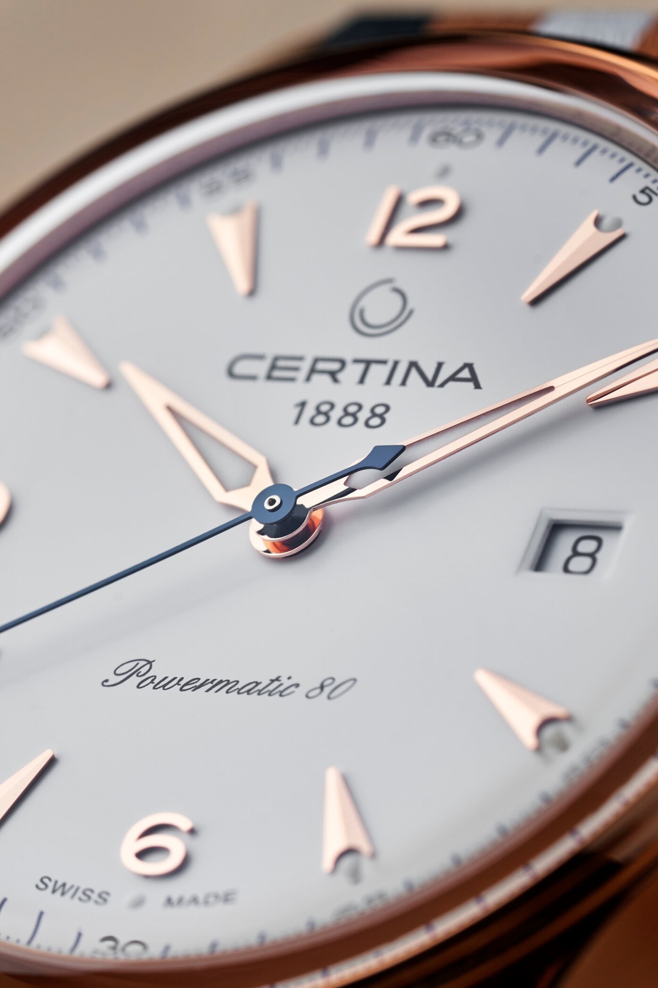 Certina DS Powermatic 80 C038.407.38.037.00 to męski zegarek automatyczny na pasku NATO w paski ze sprzączką. Koperta wykonana ze stali nierdzewnej pokrytej metodą PVD w kolorze różowego złota ma średnicę 41 milimetrów i przezroczysty dekiel. Biała tarcza ze wskazaniem daty jest chroniona wypukłym szkłem szafirowym z powłoką antyrefleksyjną. Zastosowane indeksy godzinowe wraz ze wskazówkami pokryte są powłoką luminescencyjną Super-LumiNova®, która gwarantuje doskonałą czytelność w warunkach słabego oświetlenia. Zegarek napędzany jest mechanizmem Powermatic 80.611 z naciągiem automatycznym i rezerwą chodu wynoszącą około 80 godzin. Kaliber jest wyposażony w koło zamachowe Nivachron™, które jest specjalnym materiałem antymagnetycznym, dzięki któremu zegarek jest wysoce odporny na pola magnetyczne. Ten mechanizm z funkcją hakowania można w razie potrzeby nakręcić również ręcznie za pomocą sygnowanej koronki. W modelu zastosowano technologię DS (Double Security), stosowaną i doskonaloną od 1959 roku, dzięki której zegarek ma zwiększoną odporność na uderzenia i wodę. Wodoodporność zegarka wynosi 10 ATM i dlatego nadaje się do pływania i snorkelingu.