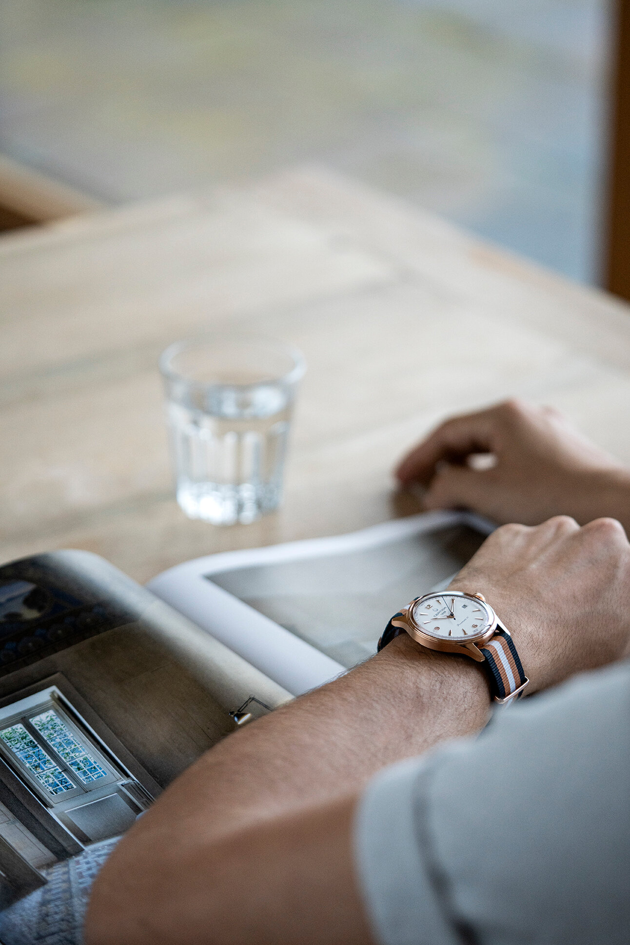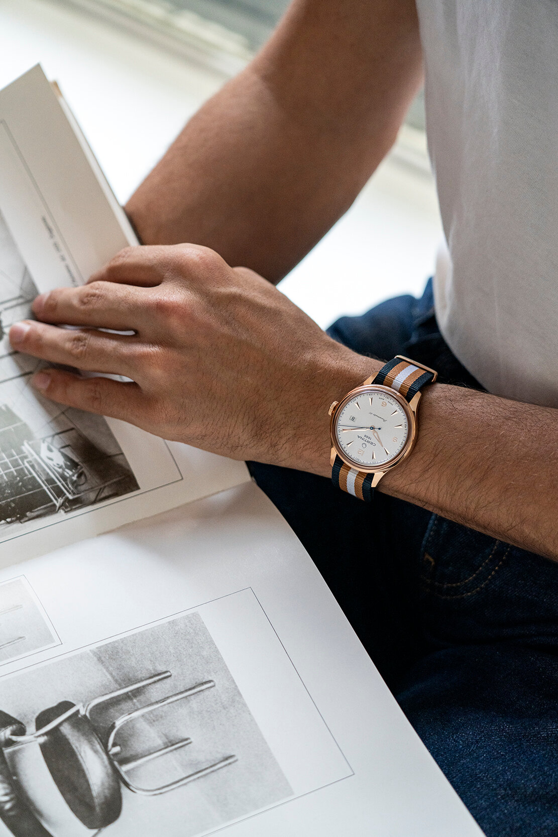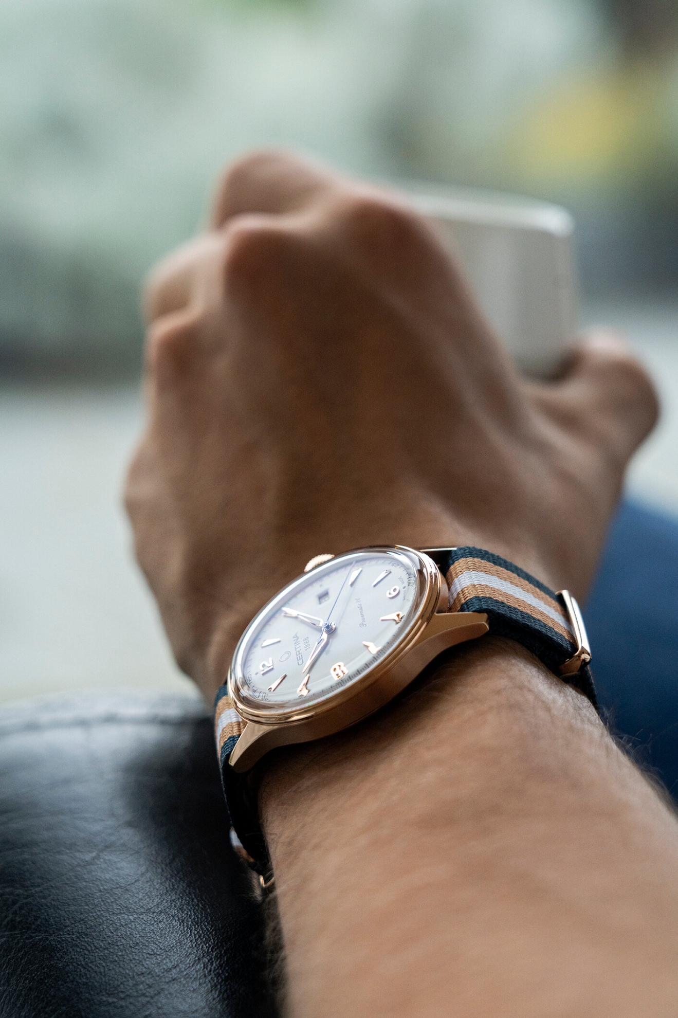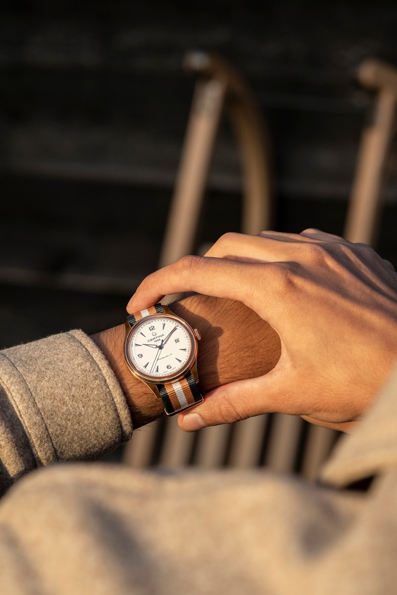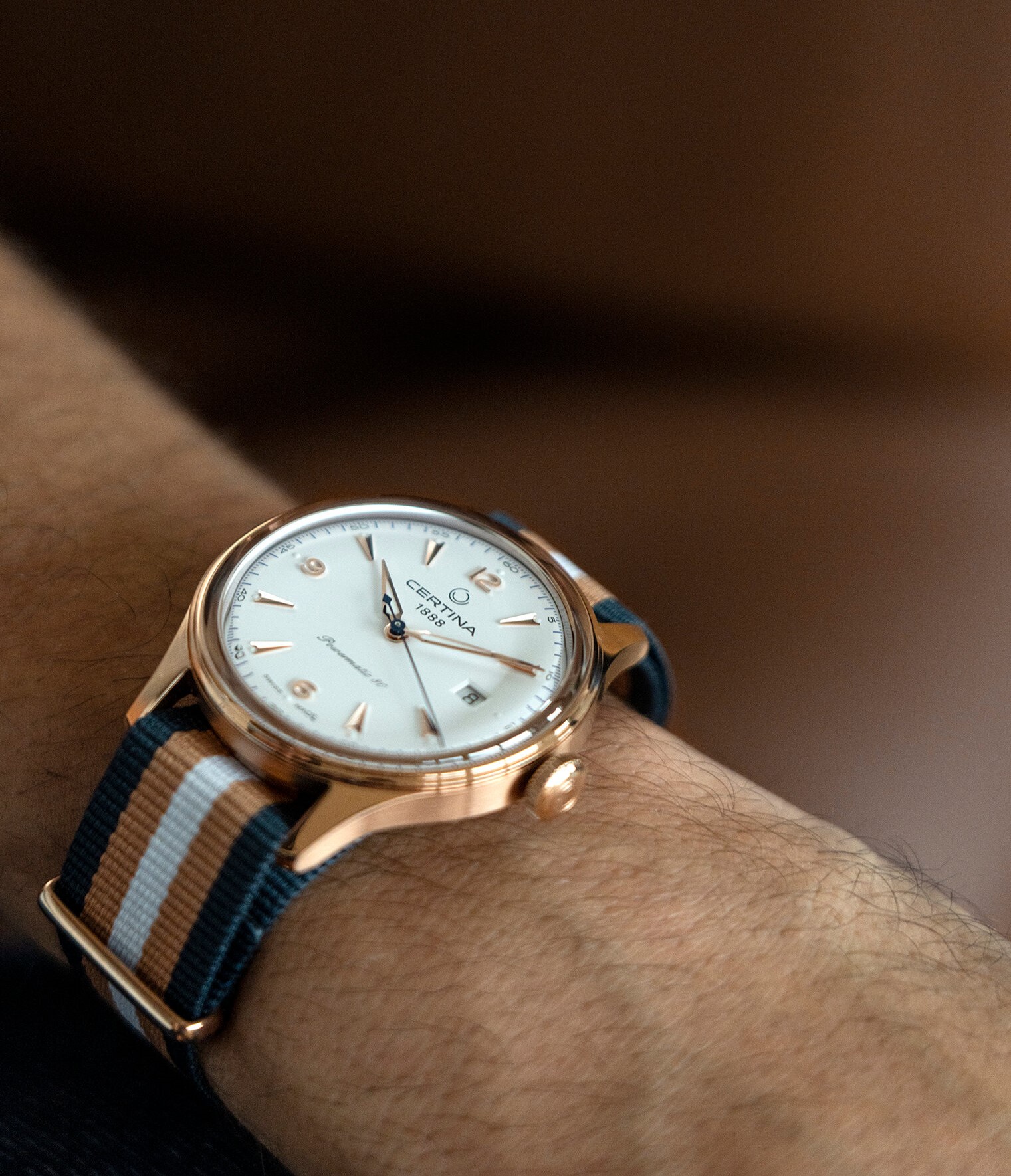 Certina DS Powermatic 80 C038.407.38.037.00 to męski zegarek automatyczny na pasku NATO w paski ze sprzączką. Koperta wykonana ze stali nierdzewnej pokrytej metodą PVD w kolorze różowego złota ma średnicę 41 milimetrów i przezroczysty dekiel. Biała tarcza ze wskazaniem daty jest chroniona wypukłym szkłem szafirowym z powłoką antyrefleksyjną. Zastosowane indeksy godzinowe wraz ze wskazówkami pokryte są powłoką luminescencyjną Super-LumiNova®, która gwarantuje doskonałą czytelność w warunkach słabego oświetlenia. Zegarek napędzany jest mechanizmem Powermatic 80.611 z naciągiem automatycznym i rezerwą chodu wynoszącą około 80 godzin. Kaliber jest wyposażony w koło zamachowe Nivachron™, które jest specjalnym materiałem antymagnetycznym, dzięki któremu zegarek jest wysoce odporny na pola magnetyczne. Ten mechanizm z funkcją hakowania można w razie potrzeby nakręcić również ręcznie za pomocą sygnowanej koronki. W modelu zastosowano technologię DS (Double Security), stosowaną i doskonaloną od 1959 roku, dzięki której zegarek ma zwiększoną odporność na uderzenia i wodę. Wodoodporność zegarka wynosi 10 ATM i dlatego nadaje się do pływania i snorkelingu.