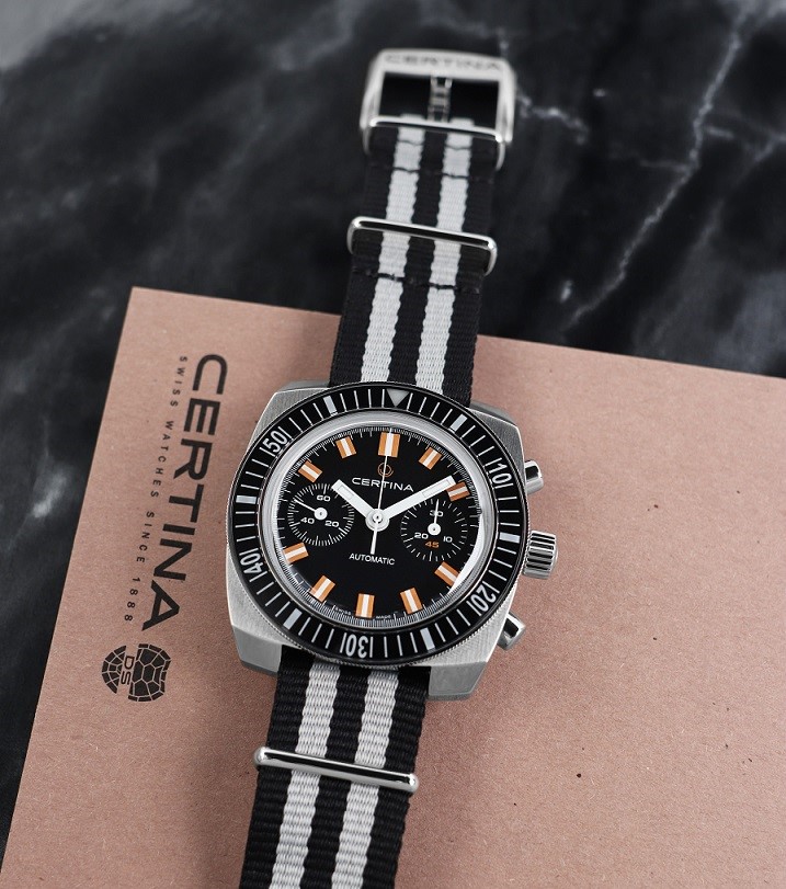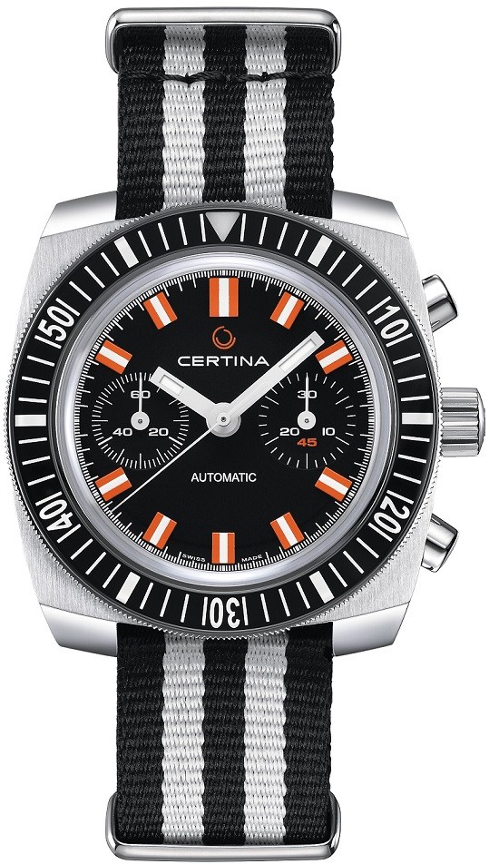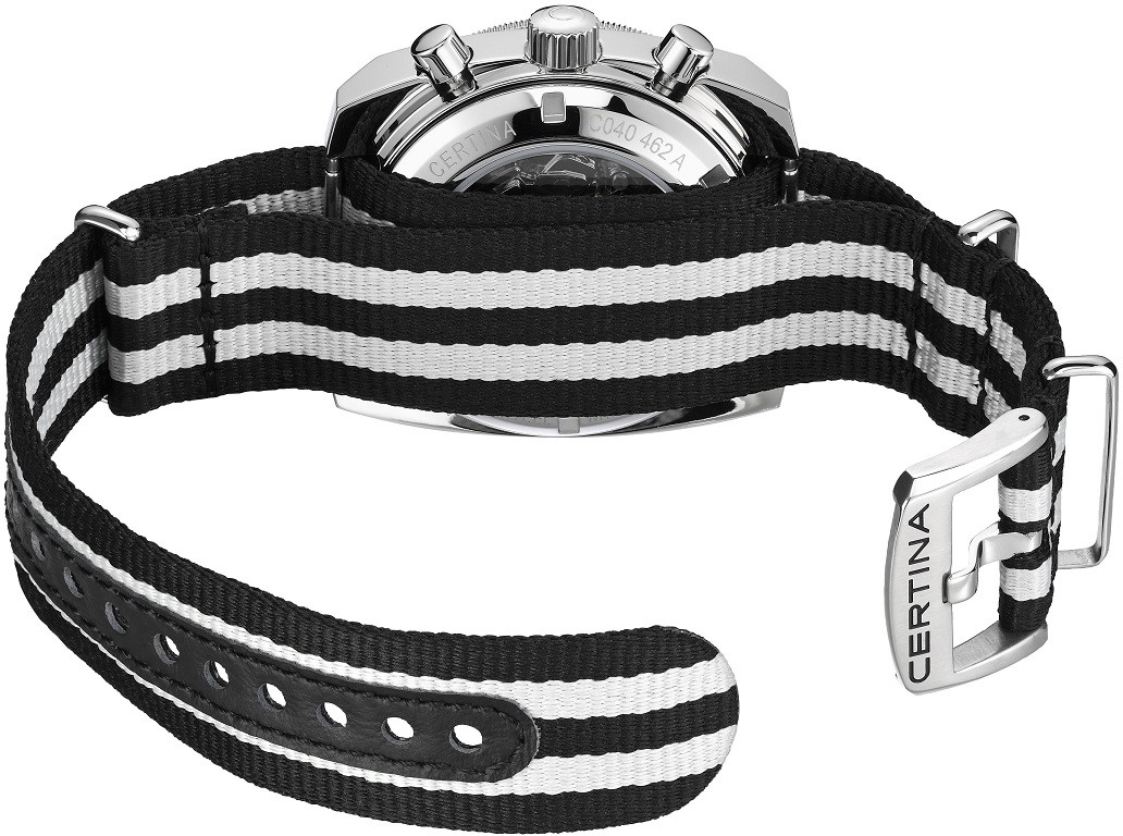 Certina DS Argonaute C040.462.18.051.00 to męski zegarek automatyczny na dwukolorowym pasku NATO z zapięciem na szpilkę. Kątowa koperta wykonana ze stali nierdzewnej w połączeniu szlifowania i polerowania ma średnicę 42,5 milimetra i przezroczysty dekiel. Czarna tarcza w stylu retro z funkcją chronografu jest chroniona wypukłym szkłem szafirowym z powłoką antyrefleksyjną. Indeksy godzinowe wraz ze wskazówkami pokryte są powłoką luminescencyjną Super-LumiNova®, która gwarantuje doskonałą czytelność w warunkach słabego oświetlenia. Zegarek napędzany jest mechanizmem ETA A05.H31 z naciągiem automatycznym i rezerwą chodu wynoszącą około 60 godzin. Kaliber wyposażony jest w krzemowe włosie koła zamachowego, które zapewnia zegarkowi dużą odporność na pola magnetyczne. Ten mechanizm z funkcją hakowania można w razie potrzeby nakręcić również ręcznie za pomocą sygnowanej koronki. W modelu zastosowano technologię DS (Double Security), stosowaną i doskonaloną od 1959 roku, dzięki której zegarek ma zwiększoną odporność na uderzenia i wodę. Wodoodporność zegarka wynosi 20 ATM, co czyni go odpowiednim wyborem do snorkelingu i nurkowania.