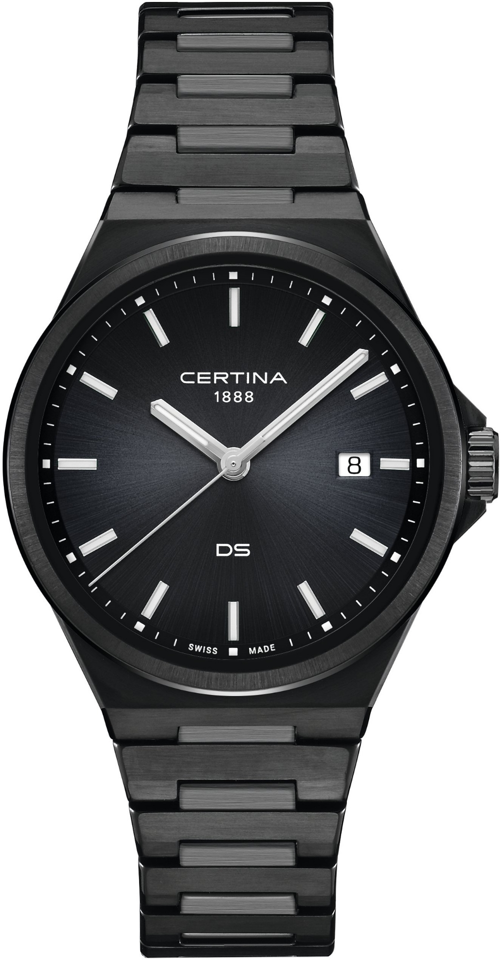 Certina DS-7 Quartz C043.410.33.051.00 to męski zegarek na baterię na zintegrowanej stalowej bransolecie z czarnym wykończeniem PVD i zapięciem motylkowym. Koperta ze stali nierdzewnej w tym samym kolorze ma średnicę 39 milimetrów i logo żółwia na deklu, który reprezentuje solidność i trwałość zegarków Certina. Czarna, gradientowa tarcza z efektem rozbłysku słońca i datownikiem na godzinie trzeciej jest chroniona wytrzymałym szkłem szafirowym z powłoką antyrefleksyjną. Zastosowane indeksy godzinowe, podobnie jak wskazówki, pokryte są powłoką luminescencyjną Super-LumiNova®, która gwarantuje doskonałą czytelność w warunkach słabego oświetlenia.