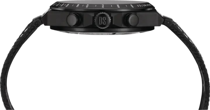 Certina DS-7 Chronograph C043.417.38.081.00 to męski zegarek na baterię na tekstylnym pasku z białymi przeszyciami i zapięciem motylkowym. Koperta ze stali nierdzewnej z wykończeniem PVD w kolorze czarnym ma średnicę 41 milimetrów i bezel ze skalą tachymetryczną, której można używać w połączeniu ze stoperem do pomiaru prędkości poruszających się obiektów. Na deklu znajdziemy logo w kształcie żółwia, które reprezentuje solidność i trwałość zegarków Certina. Czarna, gradientowa tarcza z datownikiem i funkcją chronografu jest chroniona wytrzymałym szkłem szafirowym z powłoką antyrefleksyjną. Zastosowane indeksy godzinowe, podobnie jak wskazówki, pokryte są powłoką luminescencyjną Super-LumiNova®, która gwarantuje doskonałą czytelność w warunkach słabego oświetlenia. Zegarek napędzany jest mechanizmem kwarcowym ETA G10.212 z technologią Precidrive z dokładnością +/- 10 sekund na rok i sygnalizacją niskiego poziomu baterii. W modelu zastosowano technologię DS (Double Security), stosowaną i doskonaloną od 1959 roku, dzięki której zegarek ma zwiększoną odporność na uderzenia i wodę. Wodoodporność zegarka wynosi 10 ATM i dlatego nadaje się do pływania i snorkelingu.