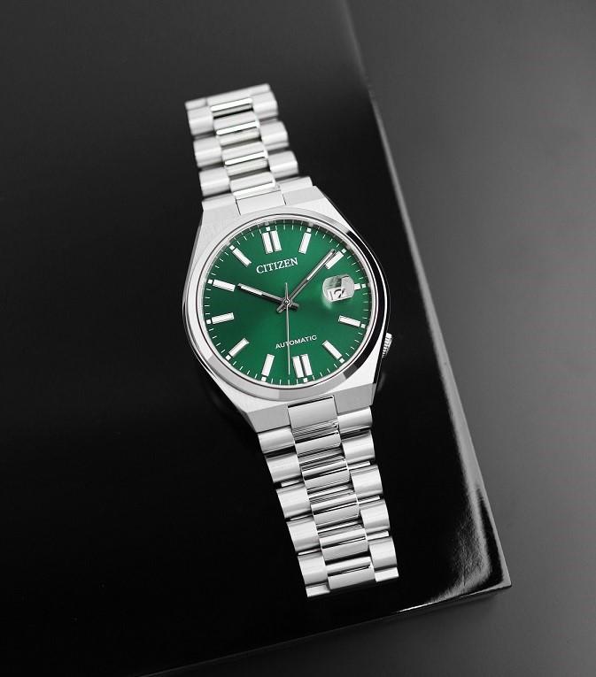 Zegarki z kolekcji Citizen Tsuyosa charakteryzują się popularną zintegrowaną bransoletą, która była tak popularna w latach 70. XX wieku, a dziś ponownie zyskuje na popularności. Średnica koperty ze stali nierdzewnej wynosi 40 mm, co w połączeniu z zagłębioną koronką do ustawiania czasu na godzinie 4 gwarantuje komfort noszenia. Zielona tarcza ze szlifem słonecznym i zastosowanymi indeksami luminescencyjnymi jest przykryta szafirowym szkiełkiem ze szkłem powiększającym nad datownikiem. Zegarek napędzany jest mechanizmem automatycznym Citizen 8210 o częstotliwości pracy 3 Hz i rezerwie chodu wynoszącej 40 godzin. Wodoszczelność zegarka wynosi 5 ATM.