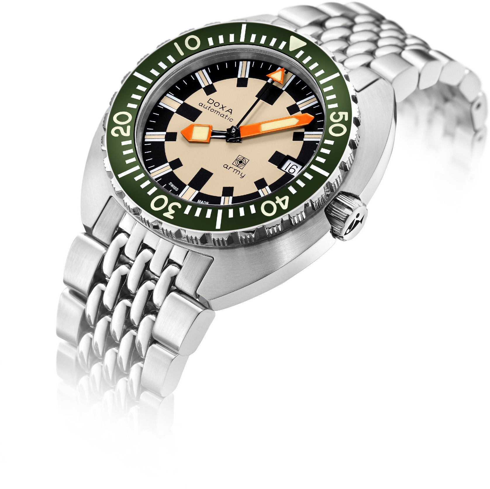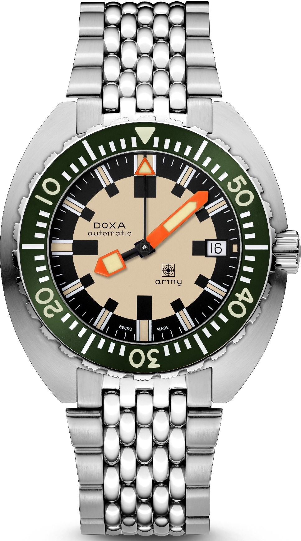 Doxa Army 785.10.031G.10 to męski, automatyczny zegarek o sportowym charakterze, który nawiązuje do legendarnego modelu Army z lat 70., jednocześnie wzbogacając go o nowoczesne akcenty. Ten model osadzono na kultowej, stalowej bransolecie typu „beads of rice”, która zawdzięcza swoją nazwę środkowym ogniwom przypominającym drobne ziarenka ryżu. Ten unikalny splot zapewnia zarówno komfort noszenia, jak i charakterystyczny, vintage'owy wygląd. Bransoleta jest wyposażona w solidne zapięcie motylkowe z mechanizmem rozszerzającym dla nurków, umożliwiającym łatwe założenie zegarka na piankę nurkową.