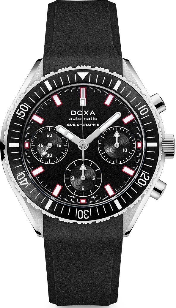 Doxa SUB 200 C-Graph II Sharkhunter 797.10.101.20 to męski, automatyczny zegarek z funkcją chronografu, stworzony dla tych, którzy cenią niezawodność i styl w ekstremalnych warunkach. Ten model jest osadzony na wygodnym, czarnym kauczukowym pasku z klasyczną sprzączką, idealnym do aktywnego użytkowania.
