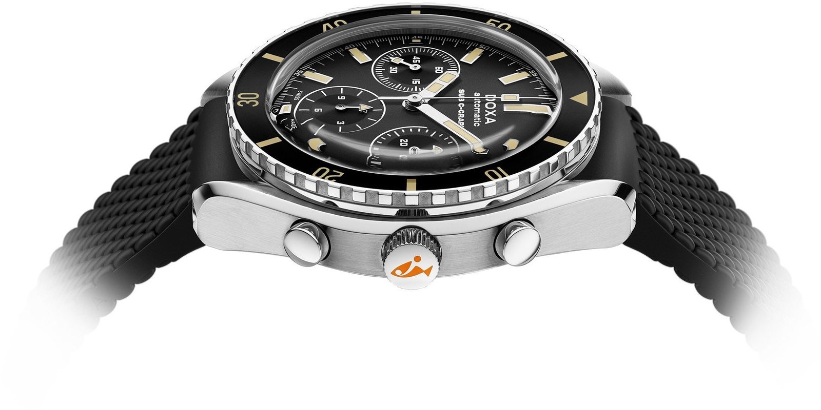 Uwagę przyciąga czarna tarcza z chronografem, która, oprócz standardowych wskazań czasu, posiada funkcje stopera, umożliwiające pomiar odcinków czasu. Całość jest chroniona przez niezwykle wytrzymałe szafirowe szkłoszkło z powłoką antyrefleksyjną, zapewniające doskonałą czytelność nawet w trudnych warunkach oświetleniowych, eliminując niepożądane odblaski. Wskazówki i indeksy pokryte są szwajcarską masą luminescencyjną SuperLuminova®, która po naświetleniu gwarantuje perfekcyjną czytelność w każdych warunkach oświetleniowych, nawet w głębokiej wodzie.
