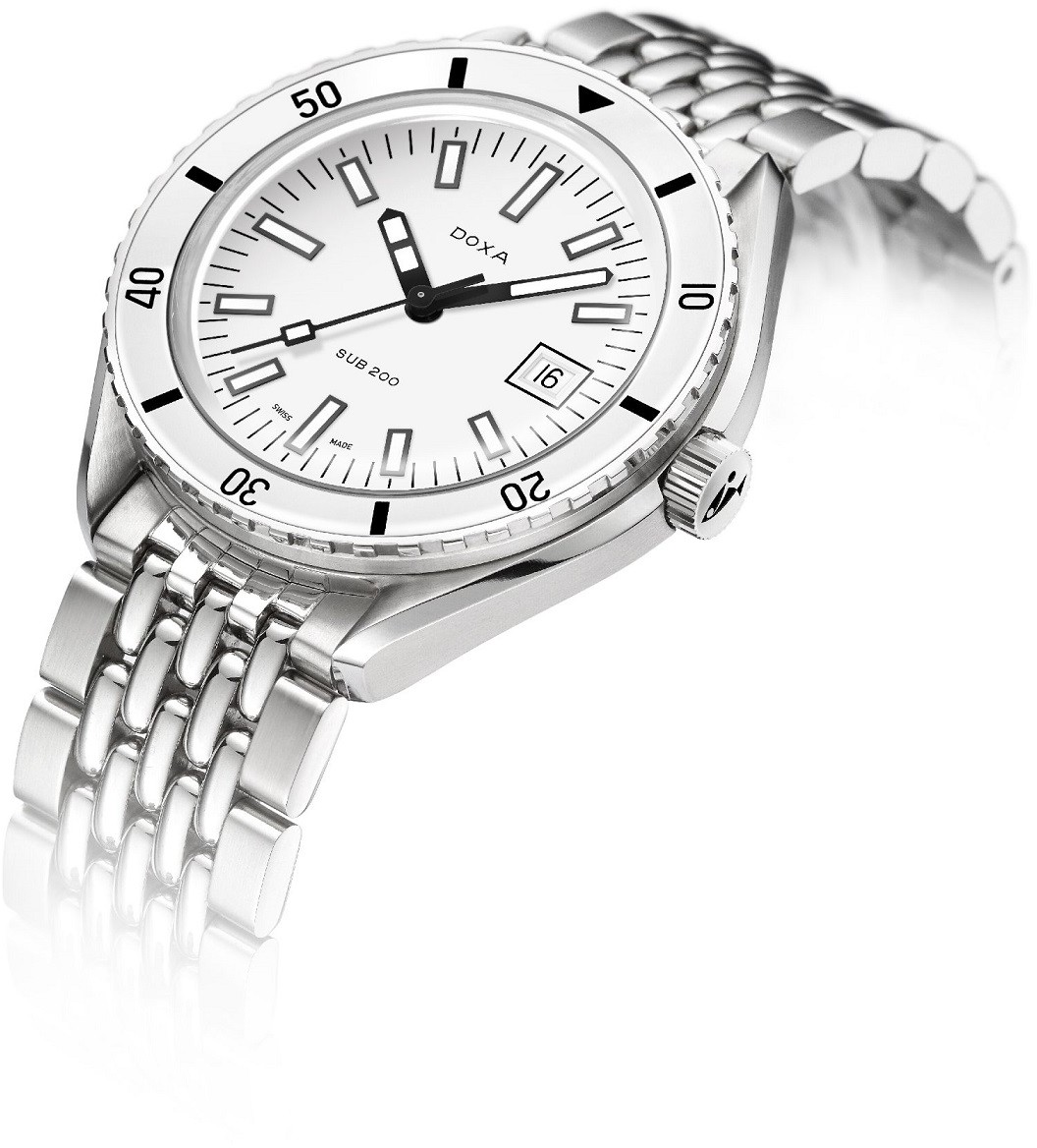 Doxa SUB 200 Whitepearl 799.10.011.10 to męski, automatyczny zegarek, który łączy klasyczny styl z niezawodnością, sprawdzając się zarówno podczas codziennego użytkowania, jak i podwodnych przygód. Zegarek jest osadzony na kultowej, stalowej bransolecie typu „beads of rice” (ziarna ryżu), która zawdzięcza swoją nazwę środkowym ogniwom przypominającym drobne ziarenka ryżu, zapewniając komfort i unikalny wygląd. Bransoleta jest wyposażona w solidne zapięcie motylkowe z rozszerzeniem dla nurków.
