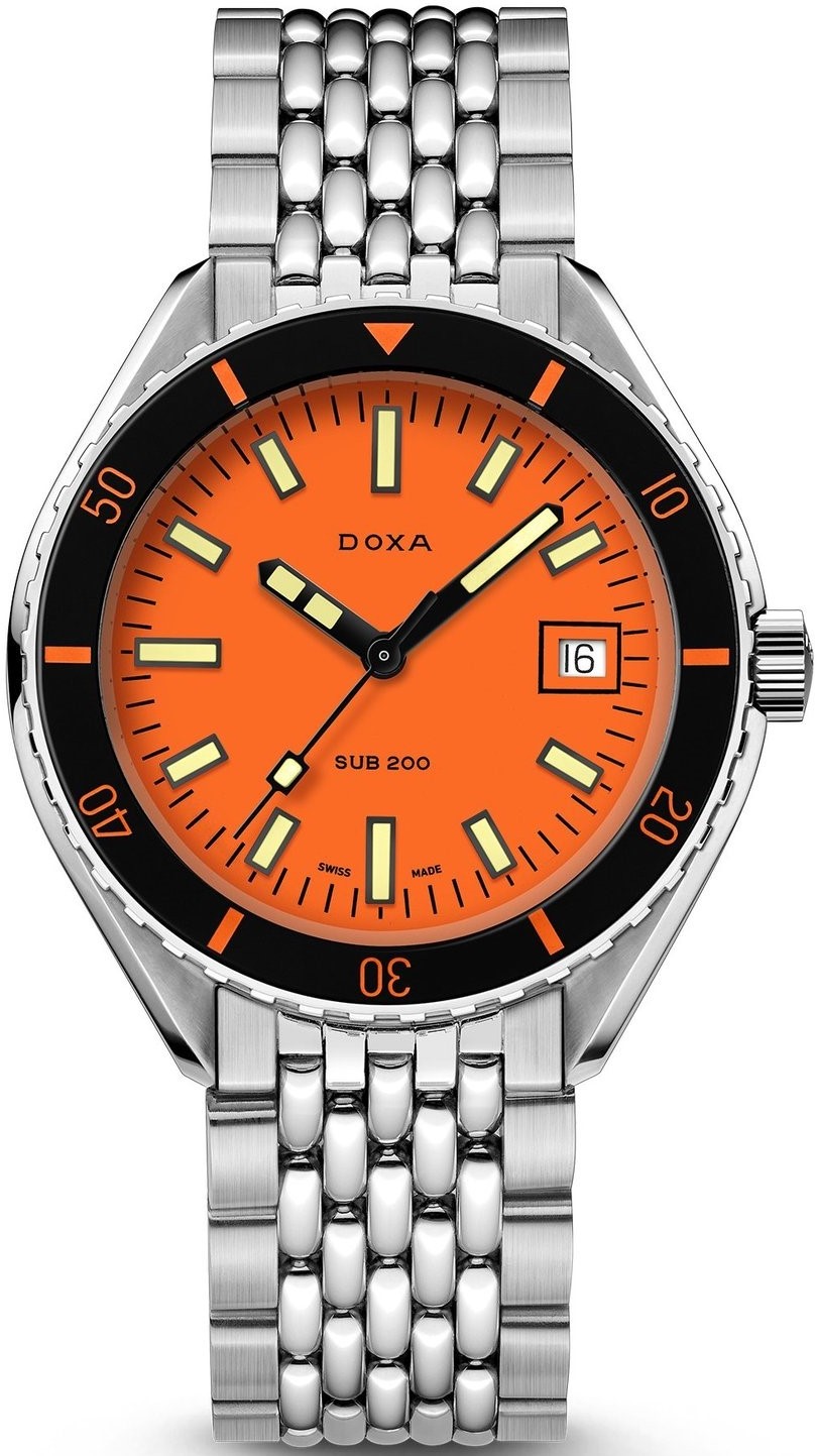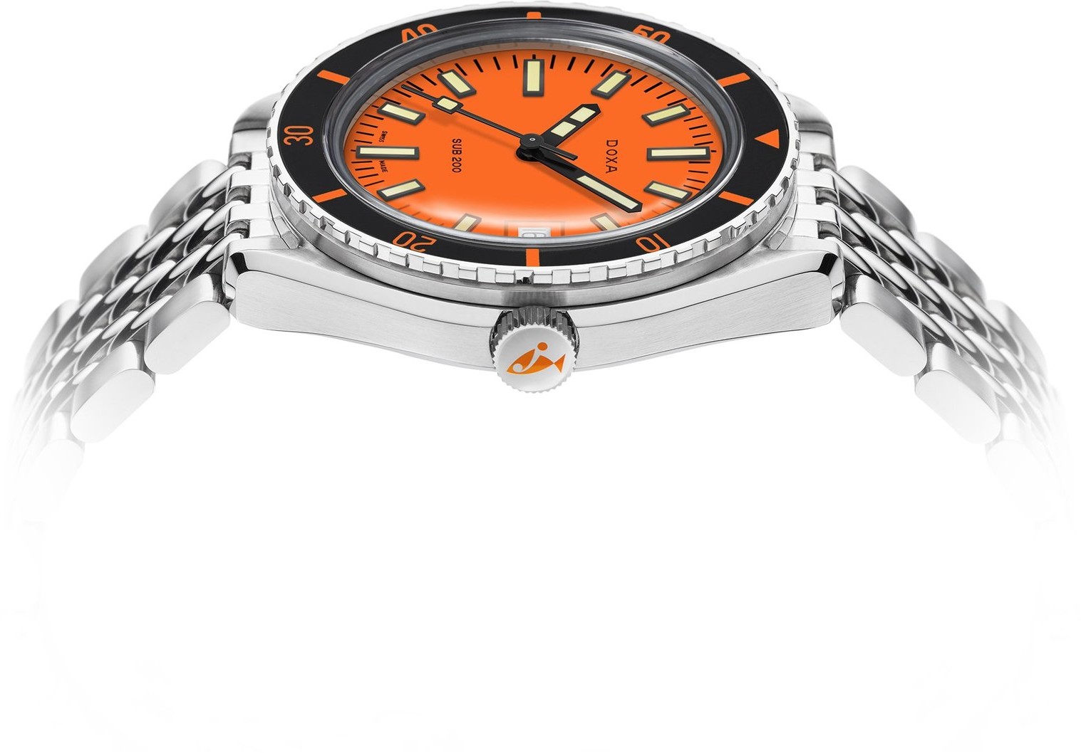 Uwagę przyciąga jaskrawo pomarańczowa tarcza, która jest znakiem rozpoznawczym modeli "Professional" Doxy, zapewniając doskonałą czytelność nawet w trudnych warunkach. Datownik, umieszczony na godzinie trzeciej, uzupełnia funkcjonalność. Tarczę chroni niezwykle wytrzymałe szafirowe szkłoszkło z powłoką antyrefleksyjną, zapewniające optymalną widoczność bez zbędnych odblasków. Wskazówki, indeksy oraz bezel pokryte są szwajcarską masą luminescencyjną SuperLuminova®, która po naświetleniu gwarantuje perfekcyjną czytelność w każdych warunkach oświetleniowych, nawet w głębokiej wodzie.