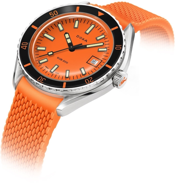 Uwagę przyciąga jaskrawo pomarańczowa tarcza, która jest znakiem rozpoznawczym modeli "Professional" Doxy, zapewniając doskonałą czytelność nawet w trudnych warunkach podwodnych. Datownik, umieszczony na godzinie trzeciej, uzupełnia funkcjonalność. Tarczę chroni niezwykle wytrzymałe szafirowe szkłoszkło z powłoką antyrefleksyjną, zapewniające optymalną widoczność bez zbędnych odblasków. Wskazówki, indeksy oraz bezel pokryte są szwajcarską masą luminescencyjną SuperLuminova®. Po naświetleniu SuperLumiNova gwarantuje perfekcyjną widoczność nawet w całkowitej ciemności, co jest nieocenione podczas nocnych nurkowań lub w głębokiej wodzie.