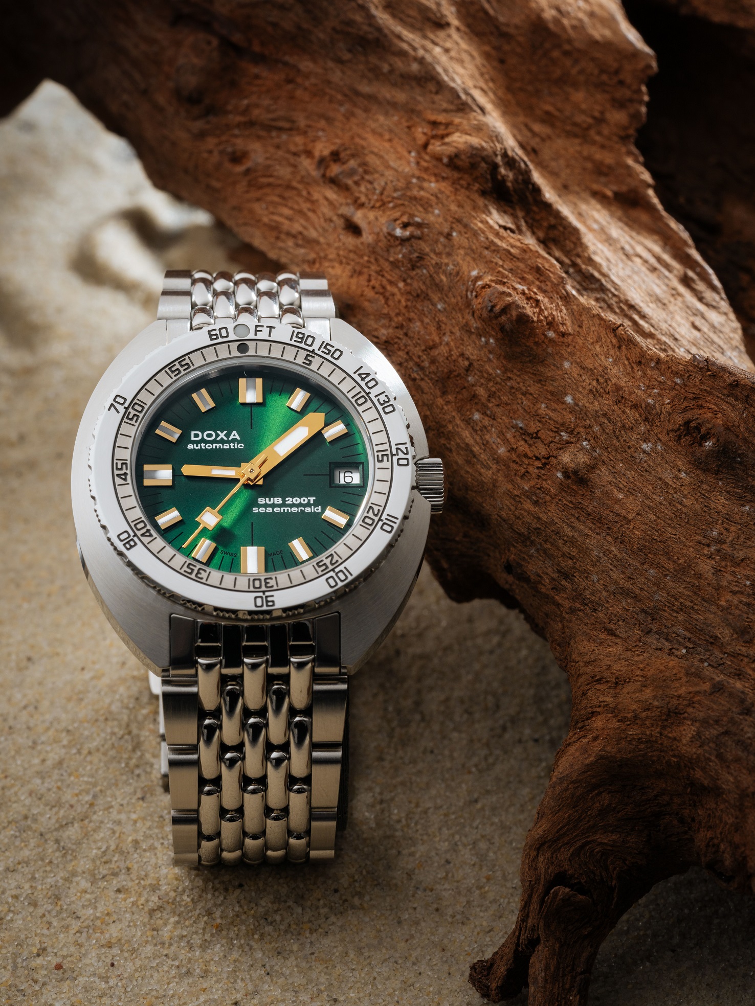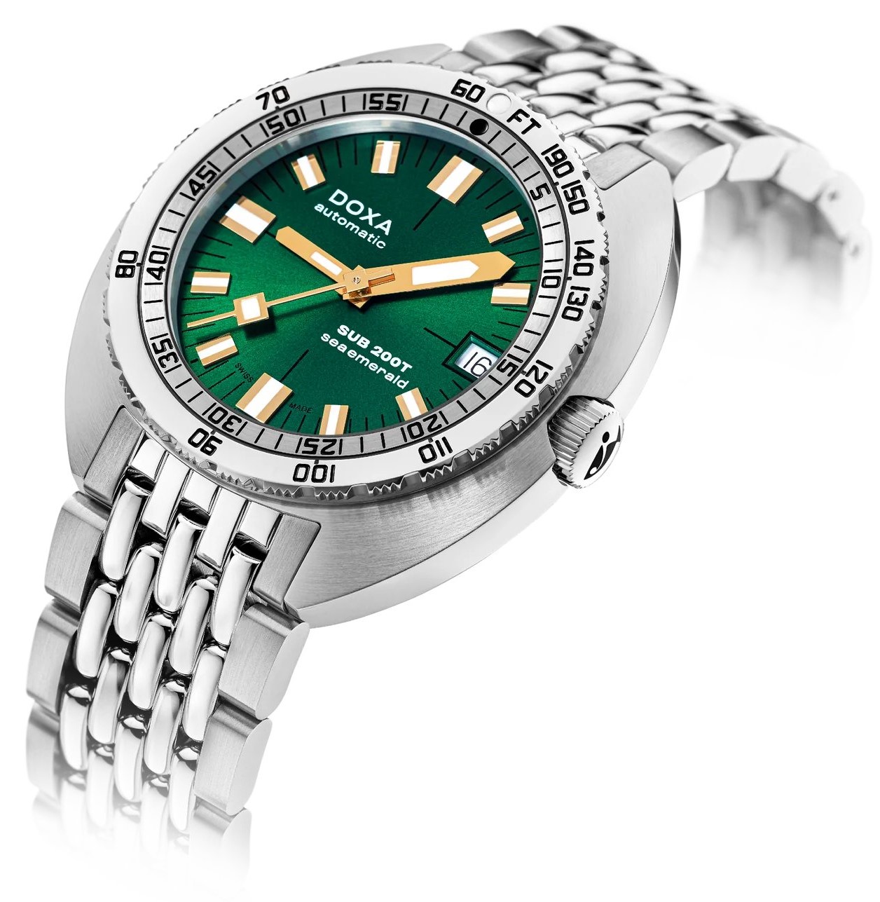 Doxa SUB 200T to model, który zostanie wprowadzony na rynek w 2024 roku, ale jest to również zegarek, który czerpie korzyści z całej nowoczesnej historii marki. Jest to nowoczesna i pomniejszona interpretacja legendarnego modelu SUB 300, który Doxa nadal ma w ofercie. Charakterystyczna koperta w kształcie poduszeczki ma średnicę 39 milimetrów i grubość zaledwie 10,7 milimetra. Doxa SUB 200T to pełnoprawny zegarek do nurkowania, odpowiedni nawet dla użytkowników o mniejszych nadgarstkach. Projekt zegarka wykorzystuje wszystkie typowe elementy legendarnego modelu nurkowego 300. Do siedmiu charakterystycznych kolorów tarczy, które po raz pierwszy są dostępne nie tylko w wersji matowej, ale również z efektem sunburst, Doxa dodaje również ósmy kolor - zieleń nazwaną Sea Emerald.