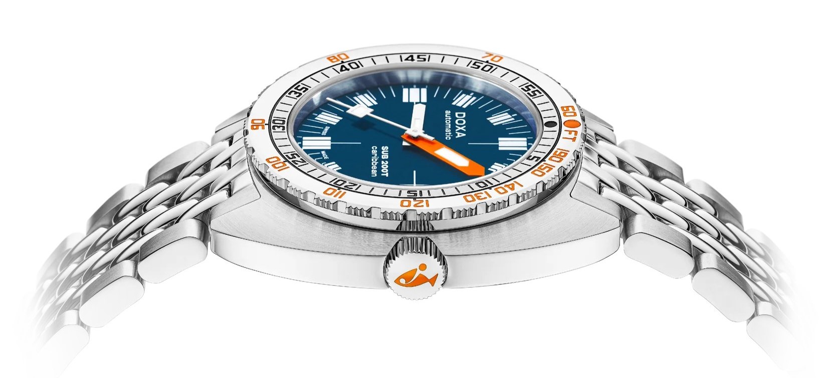 Doxa SUB 200T to model, który zostanie wprowadzony na rynek w 2024 roku, ale jest to również zegarek, który czerpie korzyści z całej nowoczesnej historii marki. Jest to nowoczesna i pomniejszona interpretacja legendarnego modelu SUB 300, który Doxa nadal ma w ofercie. Charakterystyczna koperta w kształcie poduszeczki ma średnicę 39 milimetrów i grubość zaledwie 10,7 milimetra. Doxa SUB 200T to pełnoprawny zegarek do nurkowania, odpowiedni nawet dla użytkowników o mniejszych nadgarstkach. Projekt zegarka wykorzystuje wszystkie typowe elementy legendarnego modelu nurkowego 300. Do siedmiu charakterystycznych kolorów tarczy, które po raz pierwszy są dostępne nie tylko w wersji matowej, ale również z efektem sunburst, Doxa dodaje również ósmy kolor - zieleń nazwaną Sea Emerald.