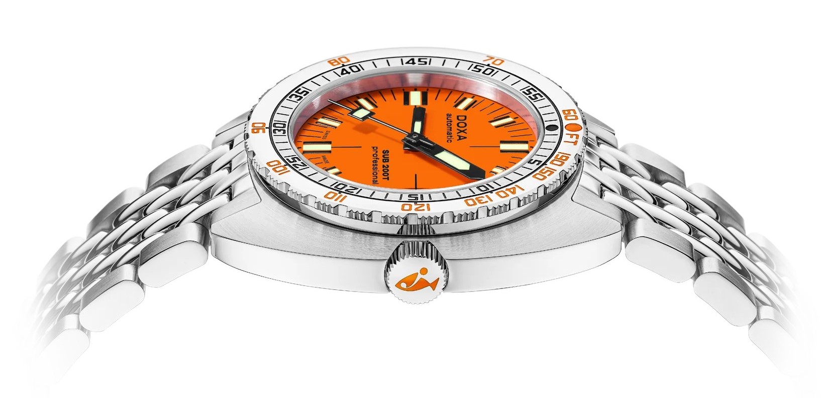 Model SUB 200T ma również typowy pierścień z podziałką potencjalnej głębokości i czasu nurkowania bezdekompresyjnego oraz charakterystyczne wskazówki zapewniające maksymalną czytelność pod wodą. Oczywiście, najwyższej klasy obróbka mechaniczna i wodoodporność do głębokości 200 metrów są także w cenie. Oprócz typowej dla tej marki bransolety ze stali nierdzewnej z stylu "beads of rice", modele 200T można również nabyć na pasku gumowym, którego kolor pasuje do tarczy.