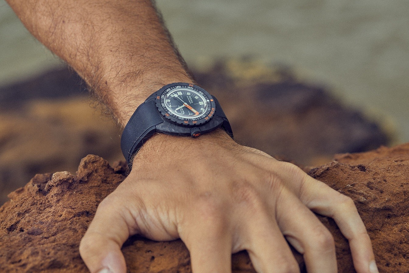 Koperta zegarka o średnicy 42,5 mm, wykonana z lekkiego i wytrzymałego karbonu, posiada zakręcaną koronkę oraz tytanowy dekiel, zapewniający dodatkową ochronę mechanizmu. Jednokierunkowo obracający się bezel z podwójną skalą ułatwia precyzyjne odczytywanie czasu nurkowania. Czarny cyferblat, z datownikiem umieszczonym na godzinie trzeciej, chroniony jest przez odporne na zarysowania szafirowe szkiełko z powłoką antyrefleksyjną. Wskazówki i indeksy pokryte są luminescencyjną masą SuperLuminova®, która po naświetleniu gwarantuje doskonałą czytelność nawet w całkowitej ciemności.