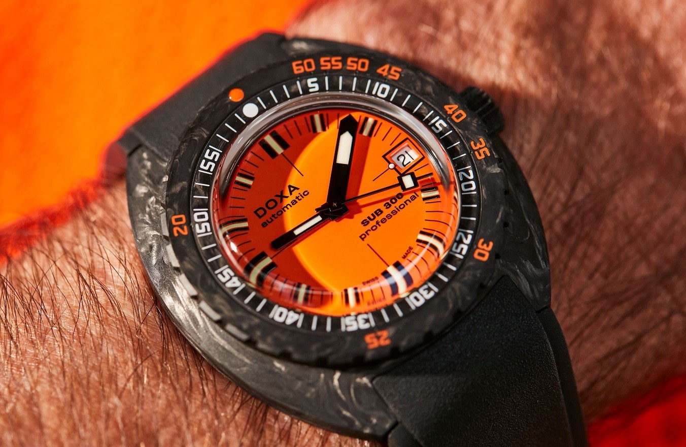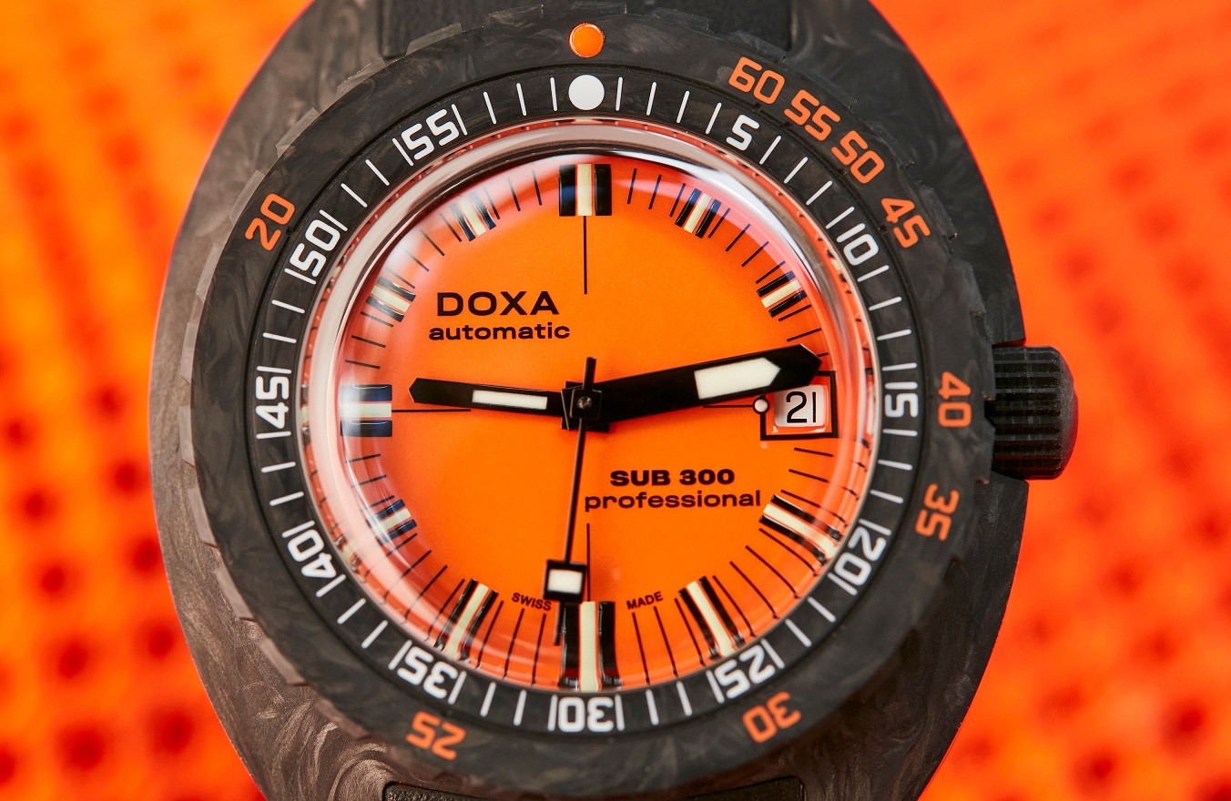 Doxa SUB 300 to żywa legenda, jedna z dwóch w portfolio marki. Jest to nowoczesna wersja tradycyjnego modelu zegarka do nurkowania wprowadzonego w 1967 roku. To właśnie ten model zdefiniował nowoczesny styl projektowania zegarków Doxa i ich praktyczne cechy. Jako pierwszy wprowadził nie tylko charakterystycznie ukształtowaną kopertę, ale także obrotowy w jednym kierunku pierścień, który oprócz skali minutowej zawiera także skalę służącą do obliczania bezpiecznej głębokości bez konieczności przystanków dekompresyjnych. Skala w tym przypadku jest ponumerowana w metrach. W modelu SUB 300 wprowadzono również radykalny pomarańczowy kolor tarczy, który okazał się bardzo praktyczny pod względem czytelności pod wodą. To właśnie kolor pomarańczowy stał się ulubionym kolorem Cousteau. Legendarny filmowiec i nurek tak bardzo pokochał ten zegarek, że jego firma, US Divers, została wyłącznym dystrybutorem marki Doxa w USA.