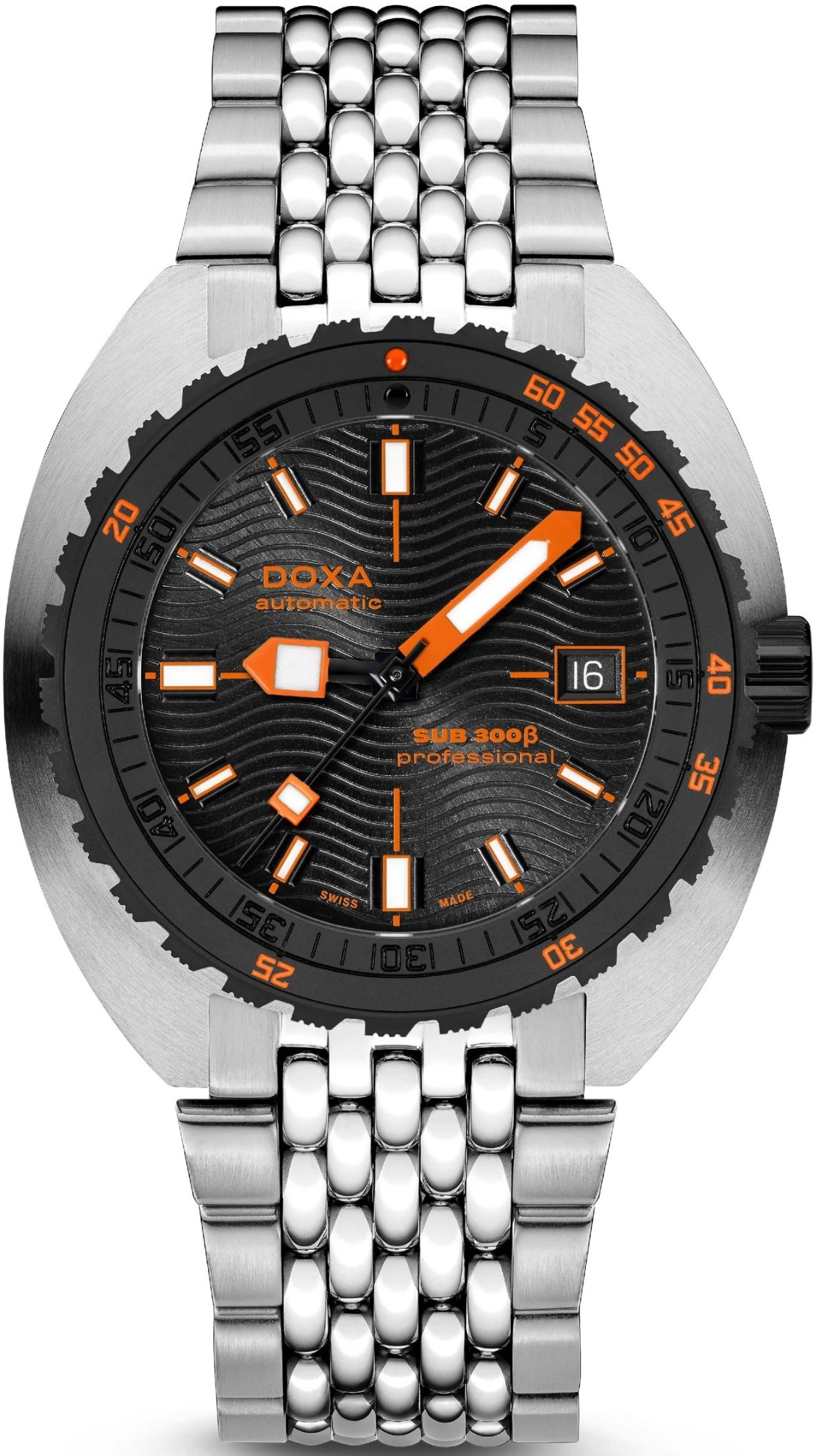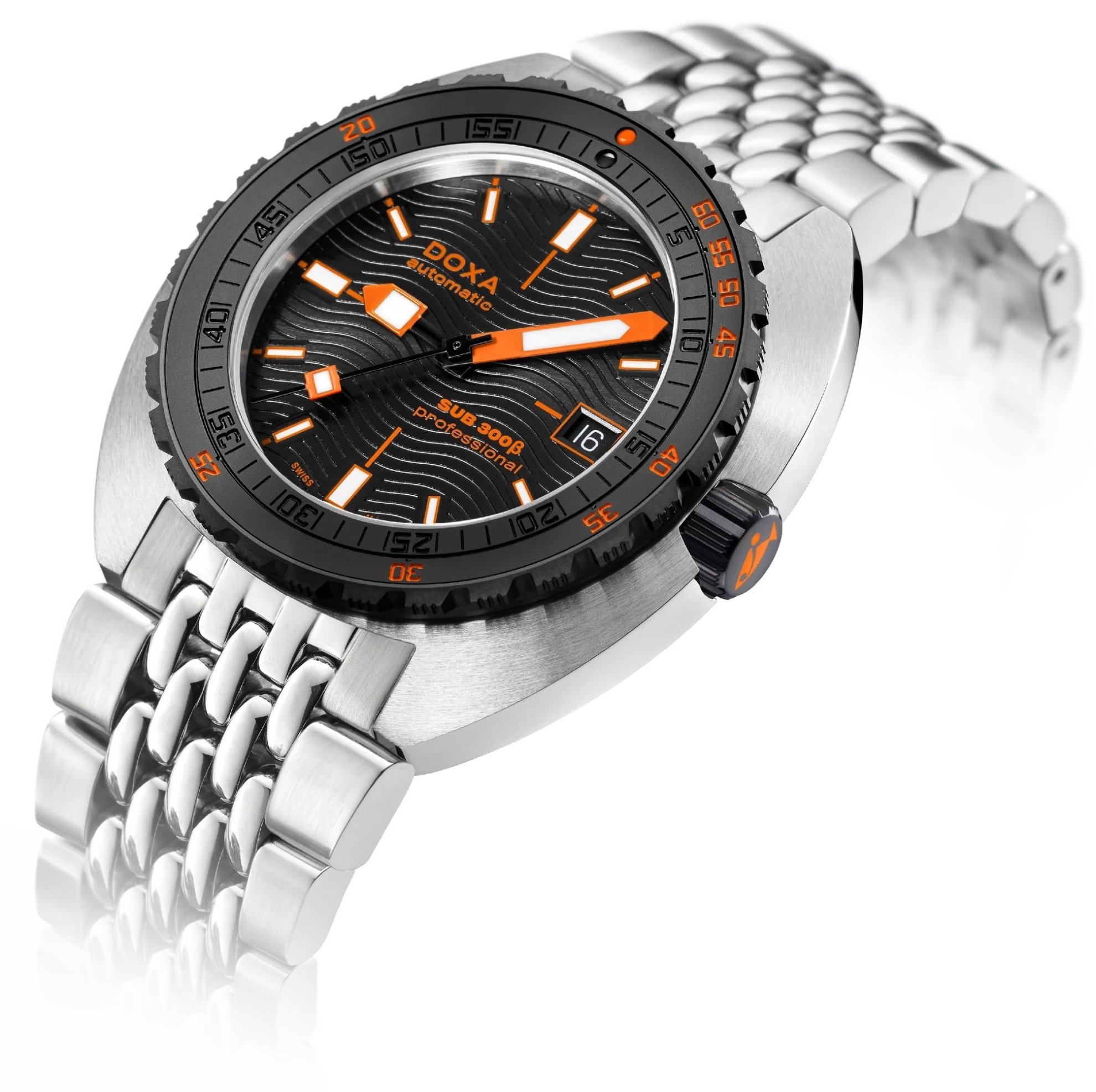 Doxa SUB 300β to żywa legenda, jedna z dwóch w portfolio marki. Jest to nowoczesna wersja tradycyjnego modelu zegarka do nurkowania wprowadzonego w 1967 roku. To właśnie ten model zdefiniował nowoczesny styl projektowania zegarków Doxa i ich praktyczne cechy. Jako pierwszy wprowadził nie tylko charakterystycznie ukształtowaną kopertę, ale także obrotowy w jednym kierunku pierścień, który oprócz skali minutowej zawiera także skalę służącą do obliczania bezpiecznej głębokości bez konieczności przystanków dekompresyjnych. Skala w tym przypadku jest ponumerowana w metrach. W modelu SUB 300β wprowadzono również radykalny pomarańczowy kolor tarczy, który okazał się bardzo praktyczny pod względem czytelności pod wodą. To właśnie kolor pomarańczowy stał się ulubionym kolorem Cousteau. Legendarny filmowiec i nurek tak bardzo pokochał ten zegarek, że jego firma, US Divers, została wyłącznym dystrybutorem marki Doxa w USA.