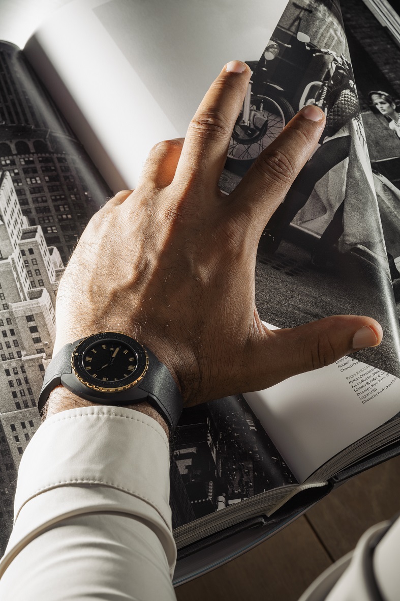 Koperta zegarka, o średnicy 42,5 mm, została wykonana z innowacyjnej czarnej ceramiki, co zapewnia jej niezwykłą lekkość i odporność na zarysowania. Od spodu kopertę zamyka tytanowy dekiel, gwarantujący dodatkową wytrzymałość i hipoalergiczność. Co wyróżnia ten model, to zastosowanie 18-karatowego żółtego złota (3N) w kluczowych elementach funkcjonalnych: zakręcana koronka oraz jednokierunkowo obracający się bezel z ceramiczną wkładką i podwójną skalą (minutową i dekompresyjną) są wykonane z tego szlachetnego metalu. To połączenie ceramiki i złota nadaje zegarkowi unikalny, luksusowy charakter, jednocześnie zachowując jego sportowe dziedzictwo.