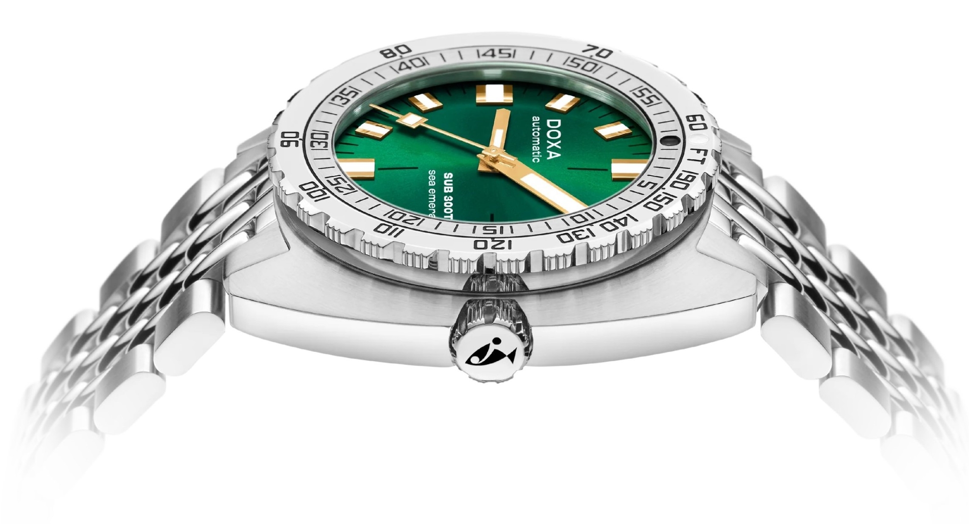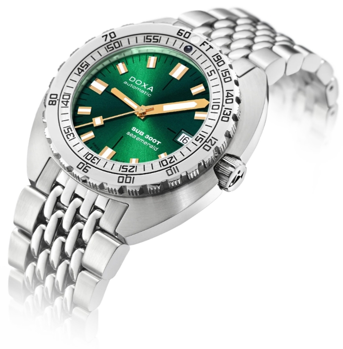 Doxa SUB 300T Sea Emerald 840.10.131.10 to męski, automatyczny zegarek nurkowy, który łączy klasyczny design z wyjątkową funkcjonalnością, stworzoną dla wymagających profesjonalistów i pasjonatów podwodnych eksploracji. Zegarek jest osadzony na kultowej, stalowej bransolecie typu „beads of rice”, która zawdzięcza swoją nazwę środkowym ogniwom przypominającym drobne ziarenka ryżu, zapewniając zarówno komfort noszenia, jak i unikalny, vintage'owy wygląd. Bransoleta jest wyposażona w solidne zapięcie motylkowe z rozszerzeniem dla nurków, umożliwiającym łatwe założenie zegarka na piankę.