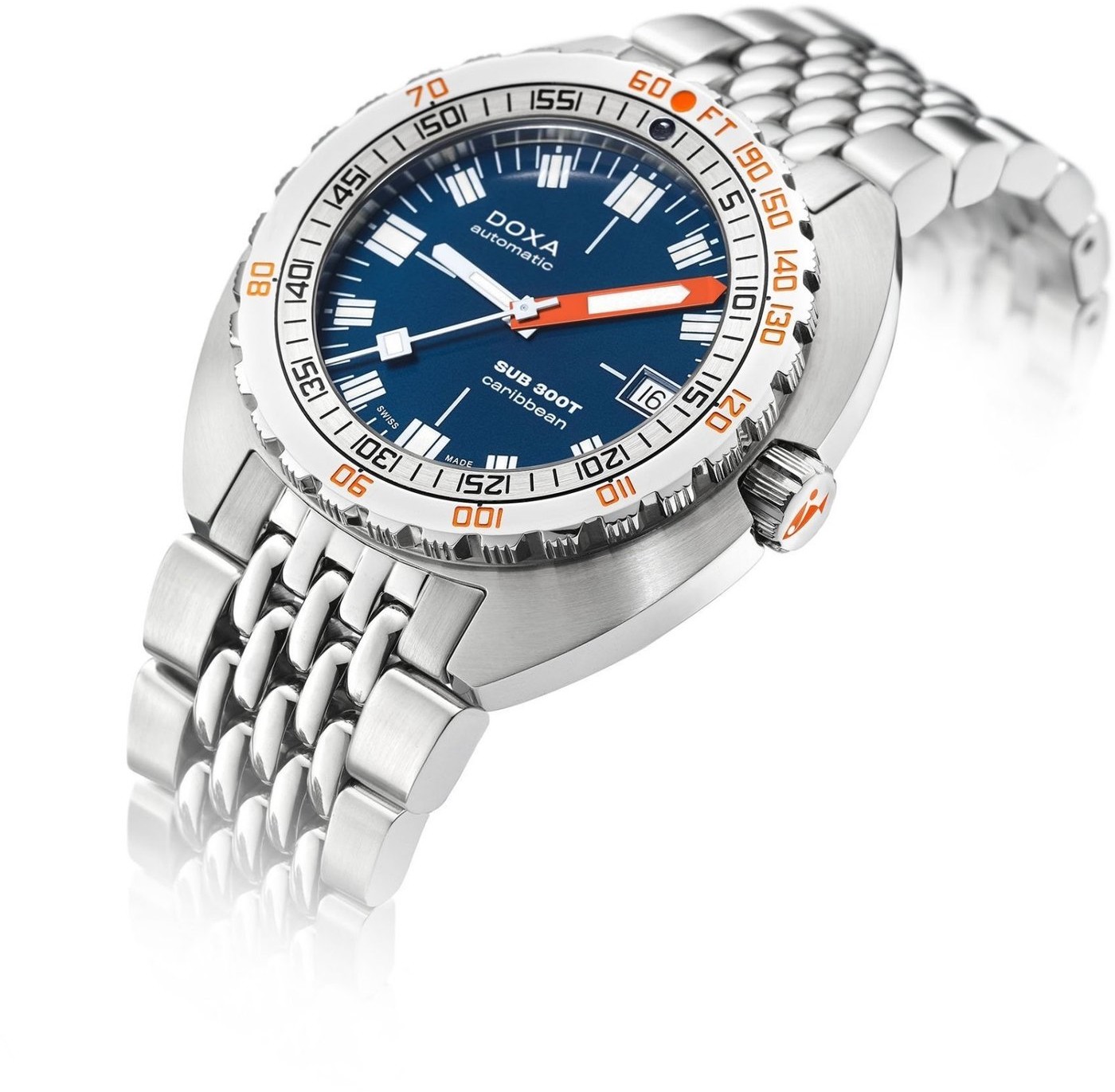 Doxa SUB 300T Caribbean 840.10.201.10 to męski, automatyczny zegarek nurkowy, który łączy legendarny design z wyjątkową funkcjonalnością, stworzoną dla wymagających profesjonalistów i pasjonatów podwodnych eksploracji. Zegarek jest osadzony na kultowej, stalowej bransolecie typu „beads of rice”, która zawdzięcza swoją nazwę środkowym ogniwom przypominającym drobne ziarenka ryżu, zapewniając zarówno komfort noszenia, jak i unikalny, vintage'owy wygląd. Bransoleta jest wyposażona w solidne zapięcie motylkowe z rozszerzeniem dla nurków, umożliwiającym łatwe założenie zegarka na piankę.