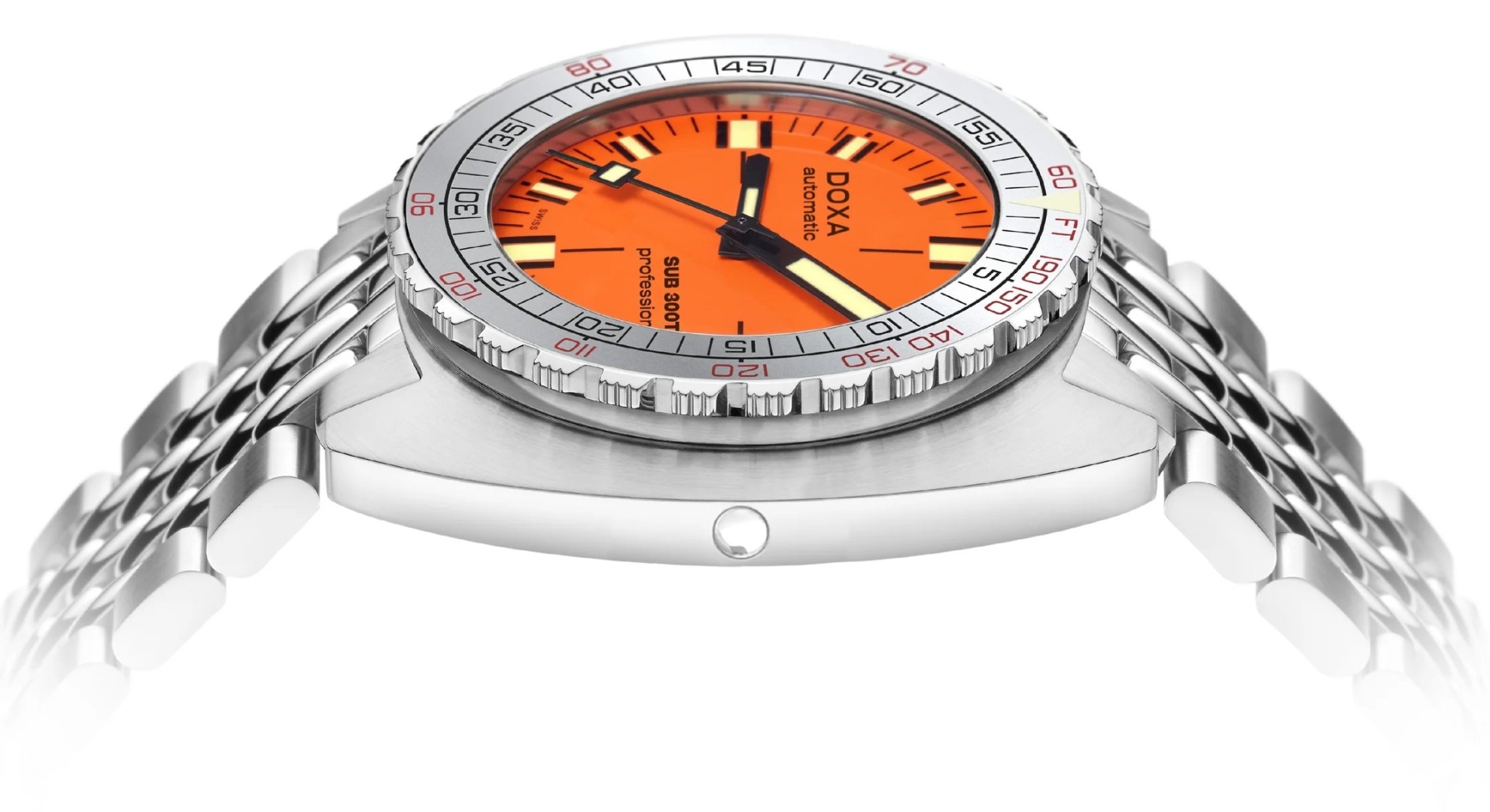 Uwagę przyciąga jaskrawo pomarańczowa tarcza, która jest znakiem rozpoznawczym modeli "Professional" Doxy, zapewniając doskonałą czytelność nawet w trudnych warunkach podwodnych. Datownik, umieszczony na godzinie trzeciej, uzupełnia funkcjonalność. Tarczę chroni niezwykle wytrzymałe szafirowe szkłoszkło z powłoką antyrefleksyjną, zapewniające optymalną widoczność bez zbędnych odblasków. Wskazówki i indeksy pokryte są szwajcarską masą luminescencyjną SuperLuminova®. Po naświetleniu SuperLumiNova gwarantuje perfekcyjną widoczność nawet w całkowitej ciemności, co jest nieocenione podczas nocnych nurkowań lub w głębokiej wodzie.