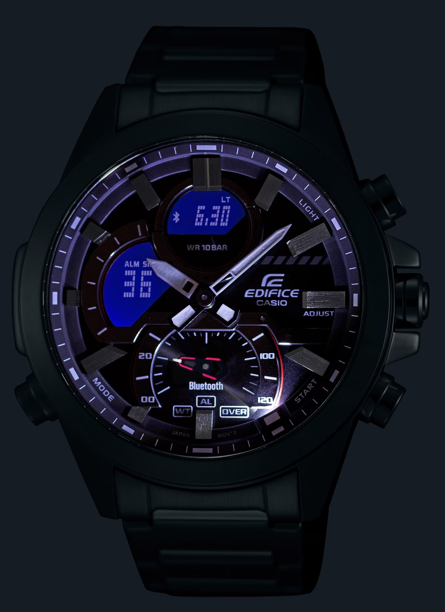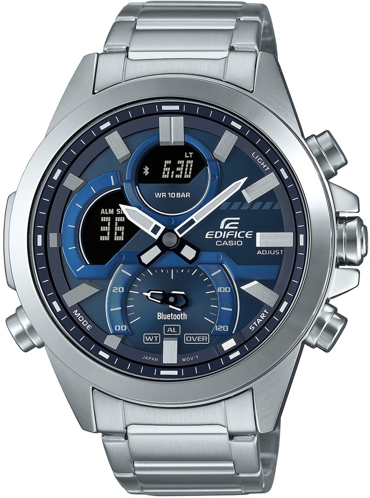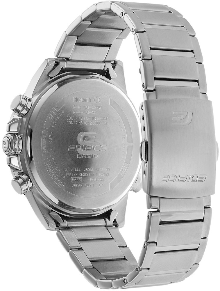 Casio Edifice ECB-30D-2AEF to męski zegarek kwarcowy, koperta średnicę 48,7 milimetra wraz z bransoletą wykonana jest ze stali nierdzewnej. Niebieska tarcza jest chroniona szkłem mineralnym. Wskazówki i indeksy pokryte są warstwą luminescencyjną, która w połączeniu z podwójnym LED podświetleniem wyświetlacza zapewnia lepszą czytelność przy słabym naświetleniu warunki. Zegarek zasilany jest mechanizmem bateryjnym i posiada funkcję stopera z dokładnością do 1/1000 sekundy, minutnik, kalendarz z datą, wskaźnikiem dnia tygodnia i miesiąca, budzik i czas światowy. Można je synchronizować ze smartfonem wykorzystującym technologię Bluetooth, a dzięki funkcji Znajdź telefon, Twój telefon zadzwoni po naciśnięciu przycisku zegarka, co ułatwi jego odnalezienie. Wodoodporność zegarka wynosi 10 ATM i dlatego nadaje się do pływania i snorkelingu.
