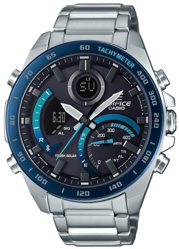 Casio Edifice Bluetooth Solar ECB-900DB-1BER to męski zegarek sportowy, którego koperta średnicę 48 milimetrów, wyposażona w stały bezel ze skalą tachymetryczną, została wykonana ze stali nierdzewnej wraz z bransoletą. Czarna tarcza z niebieskimi detalami jest chroniona szkłem mineralnym. Wskazówki i indeksy pokryte są warstwą luminescencyjną, która w połączeniu z podwójnym LED podświetleniem wyświetlacza zapewnia lepszą czytelność przy słabym naświetleniu warunki. Zegarek zasilany jest ruchem baterii słonecznej, co eliminuje konieczność wymiany baterii. Stan naładowania można monitorować na tarczy. Zegarek posiada funkcję stopera z dokładnością do 1/1000 sekundy, timer, kalendarz ze wskaźnikami daty, dnia tygodnia i miesiąca, budzik, pomiar prędkości oraz czas światowy (do 300 miast). Można je synchronizować ze smartfonem wykorzystującym technologię Bluetooth, a dzięki funkcji Znajdź telefon, Twój telefon zadzwoni po naciśnięciu przycisku zegarka, co ułatwi jego odnalezienie. Wodoodporność zegarka wynosi 10 ATM i dlatego nadaje się do pływania i snorkelingu.