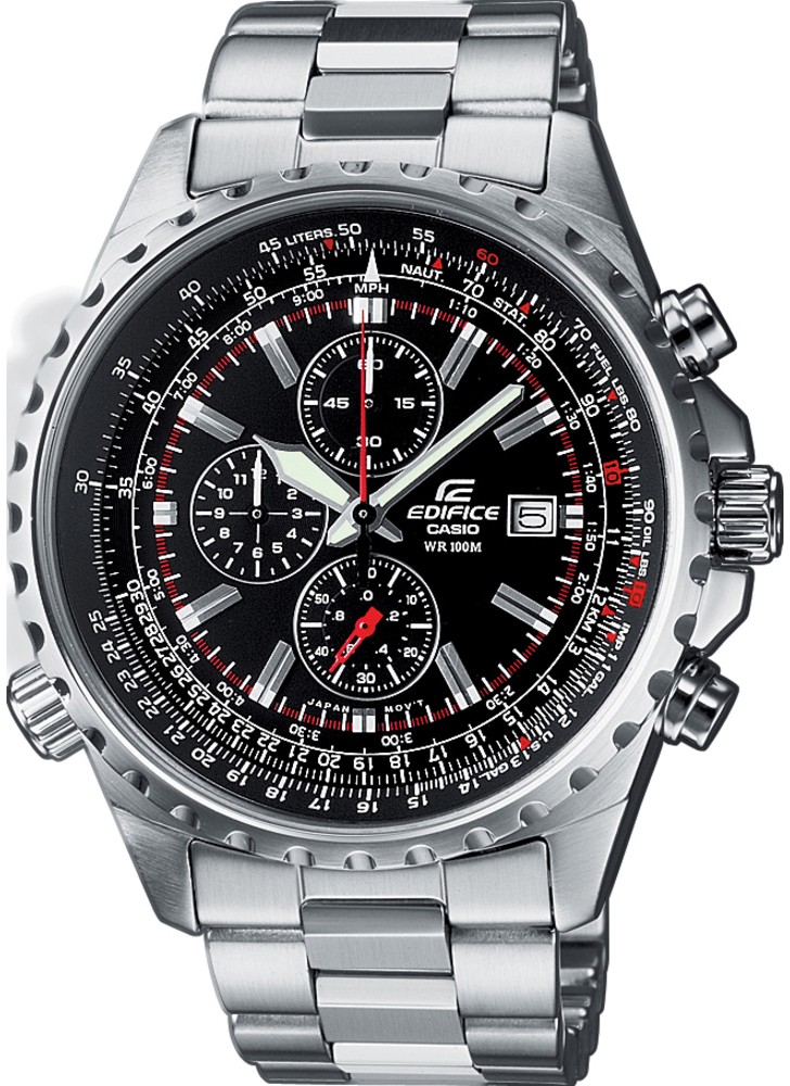 Casio Edifice EF-527D-1AVEF to męski sportowy zegarek kwarcowy w stylu pilotażowym, koperta średnicę 45,5 milimetra wykonana jest ze stali szlachetnej wraz z bransoletą. Czarna tarcza z czerwonymi detalami, chronografem i datownikiem na godzinie trzeciej jest chroniona szkłem mineralnym. Zegarek posiada wewnętrzną bezel w postaci linijki logarytmicznej, dzięki której możesz obliczyć prędkość, zużycie paliwa oraz dystans lotu. Wskazówki i indeksy zostały wyposażone w warstwę luminescencyjną, która po podświetleniu zapewnia lepszą czytelność w warunkach słabego oświetlenia. Dzięki wodoszczelności 10 ATM zegarek nadaje się do pływania i snorkelingu.