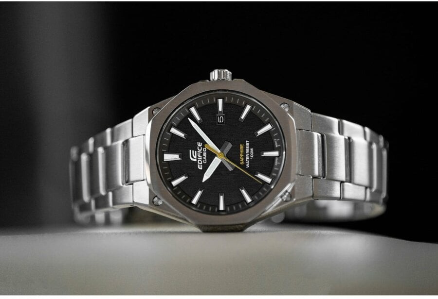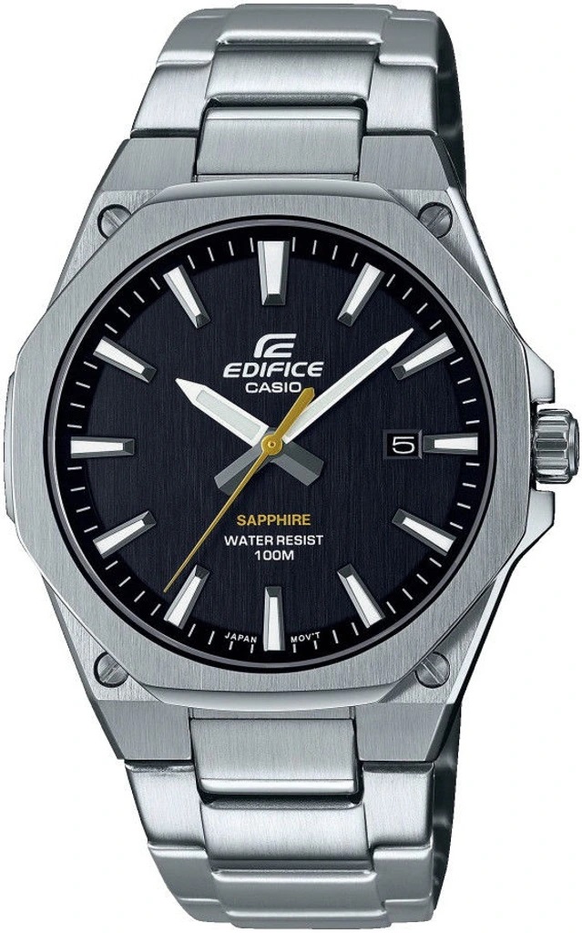 Casio Edifice EFR-S108D-1AVUEF to męski zegarek kwarcowy, koperta średnicę 39,9 milimetra wraz z bransoletą wykonana jest ze stali nierdzewnej. Czarna tarcza ze datownikiem na godzinie trzeciej jest chroniona szkłem szafirowym. Wskazówki i indeksy zostały wyposażone w warstwę luminescencyjną, która po podświetleniu zapewnia lepszą czytelność w warunkach słabego oświetlenia. Zegarek z wodoodpornością 10 ATM nadaje się do pływania i snorkelingu.