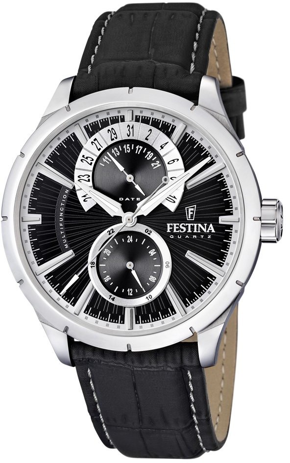 Festina Retro 16573/3 to elegancki męski zegarek na baterie na czarnym skórzanym pasku z zapinaną na szpilkę klamrą. Koperta ze stali nierdzewnej ma średnicę 46 milimetrów. Czarna tarcza o promienistej strukturze, datownik i wyświetlacz czasu w formacie 24-godzinnym jest chroniona szkłem mineralnym. Zegarek napędzany jest mechanizmem kwarcowym Miyota 6P73. Dzięki wodoodporności 5 ATM są odporne na zachlapania i prysznic.