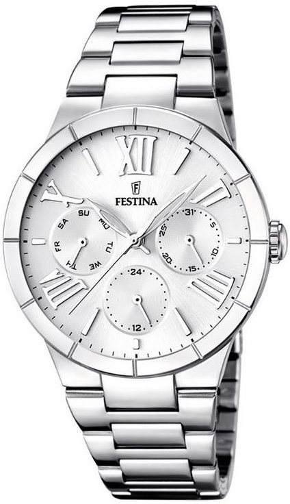 Festina Boyfriend Collection 16716/1 to damski zegarek na baterię w klasycznym stylu ze stalową bransoletą ze składanym zapięciem. Koperta ze stali nierdzewnej ma średnicę 36,5 milimetra. Srebrna tarcza ze szlifem słonecznym oraz wskaźnikiem dnia i daty jest chroniona trwałym szkłem mineralnym. Zegarek napędzany jest mechanizmem kwarcowym Miyota 6P29 i dzięki wodoodporności 5 ATM jest odporny na zachlapania i ulewę.