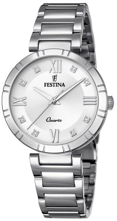 Festina Mademoiselle 16936/A to damski zegarek na baterię w klasycznym stylu na stalowej bransolecie ze składanym zapięciem. Koperta ze stali nierdzewnej ma średnicę 32,5 milimetra. Srebrna tarcza ze szlifem słonecznym ozdobiona 8 przezroczystymi cyrkoniami jest chroniona wytrzymałym szkłem mineralnym. Zegarek napędzany jest mechanizmem kwarcowym Miyota 2035 z dokładnością ±20 sekund na miesiąc. Dzięki wodoodporności 5 ATM zegarek jest odporny na zachlapania i zachlapania i opady.