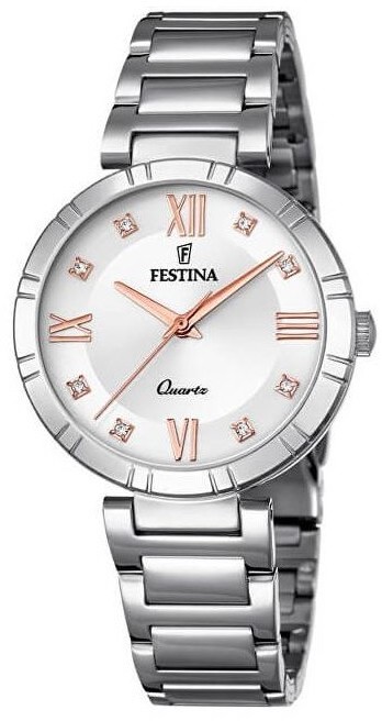 Festina Mademoiselle 16936/B to damski zegarek na baterię w klasycznym stylu na stalowej bransolecie ze składanym zapięciem. Koperta ze stali nierdzewnej ma średnicę 32,5 milimetra. Srebrna tarcza ze szlifem słonecznym ozdobiona 8 przezroczystymi cyrkoniami jest chroniona wytrzymałym szkłem mineralnym. Zegarek napędzany jest mechanizmem kwarcowym Miyota 2035 z dokładnością ±20 sekund na miesiąc. Dzięki wodoodporności 5 ATM zegarek jest odporny na zachlapania i zachlapania i opady.
