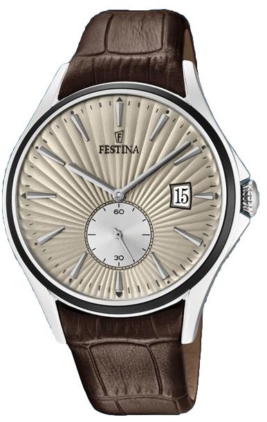 Festina Retro 16980/2 to elegancki męski zegarek na baterie na brązowym skórzanym pasku z zapięciem na sprzączkę. Koperta ze stali nierdzewnej ma średnicę 42 milimetrów. Beżowa tarcza o promienistej strukturze, datownik i mała wskazówka sekundowa jest chroniona szkłem mineralnym. Zegarek napędzany jest mechanizmem kwarcowym Miyota GP11. Dzięki wodoodporności 5 ATM są odporne na zachlapania i prysznic.