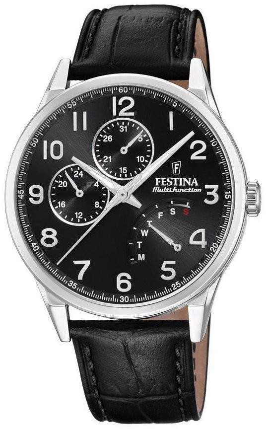 Festina Retro 20278/C to elegancki męski zegarek na baterię na czarnym skórzanym pasku ze sprzączką. Koperta ze stali nierdzewnej ma średnicę 41,5 milimetra. Czarna tarcza ze szlifem słonecznym, datownikiem, dniem tygodnia i wyświetlaniem czasu w formacie 24-godzinnym, jest chroniona plastikowym szkłem. Zegarek napędzany jest mechanizmem kwarcowym Miyota JR00. Dzięki wodoszczelności 3 ATM zegarek jest odporny na zachlapania i mycie rąk.
