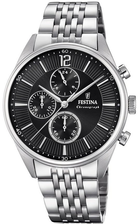 Festina Timeless Chronograph 20285/4 to męski sportowy zegarek na baterię na stalowej bransolecie ze składanym zapięciem. Koperta ze stali nierdzewnej ma średnicę 41,5 milimetra. Czarna tarcza ze stoperami i wyświetlaczem czasu w formacie 24-godzinnym jest chroniona szkłem mineralnym. Zegarek napędzany jest mechanizmem kwarcowym Miyota JS10 z dokładnością ±20 sekund na miesiąc. Dzięki wodoodporności 5 ATM zegarek jest odporny na zachlapania i zachlapania i opady.