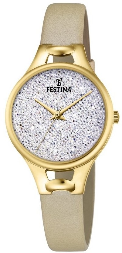 Festina Swarovski 20335/1 to damski zegarek na baterię w eleganckim stylu na beżowym skórzanym pasku z zapięciem na sprzączkę. Koperta ze stali nierdzewnej z powłoką PVD w kolorze złota ma średnicę 32 milimetrów. Srebrna tarcza ozdobiona kryształami Swarovskiego jest chroniona wytrzymałym szkłem mineralnym. Zegarek napędzany jest mechanizmem kwarcowym Miyota GL36. Dzięki wodoodporności 5 ATM zegarek jest odporny na zachlapania i zachlapania i opady.