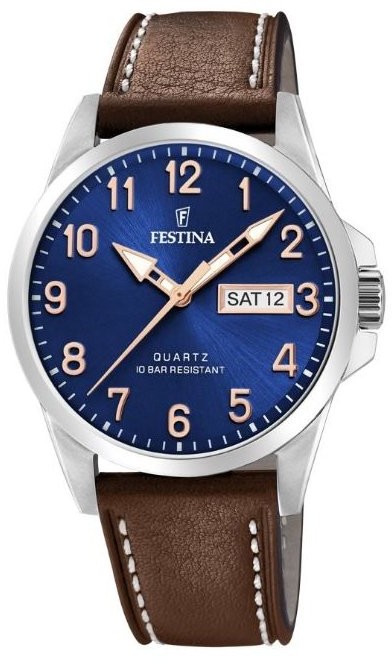 Festina Classics 20358/B to elegancki męski zegarek na baterię na brązowym skórzanym pasku z kontrastowymi przeszyciami i zapinaną na szpilkę klamrą. Koperta ze stali nierdzewnej ma średnicę 41 milimetrów. Niebieska tarcza ze szlifem słonecznym oraz wskaźnik dnia i daty na godzinie trzeciej jest chroniona trwałym szkłem mineralnym. Wskazówki mają powłokę luminescencyjną, która po naświetleniu ułatwia czytanie w słabych warunkach oświetleniowych. Za ruch zegarka odpowiada mechanizm kwarcowy Miyota 1S02 z dokładnością ±20 sekund na miesiąc. Dzięki wodoodporności 10 ATM zegarek nadaje się do pływania i snorkelingu.