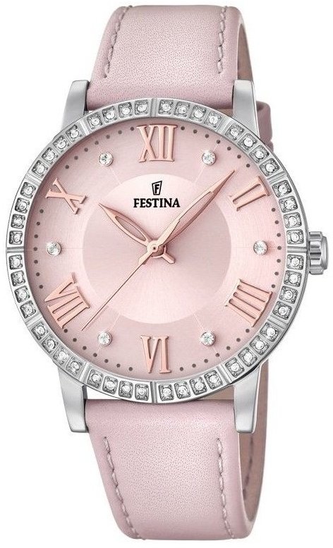 Festina Boyfriend Collection 20412/2 to elegancki damski zegarek na baterię z różowym skórzanym paskiem zapinanym na sprzączkę. Koperta ze stali nierdzewnej ma średnicę 36,5 milimetra, a ramka jest ozdobiona dookoła przezroczystymi cyrkoniami. Delikatna różowa tarcza z cyframi rzymskimi w kolorze różowego złota i 6 cyrkoniami jest chroniona wytrzymałym szkłem mineralnym. Zegarek napędza mechanizm kwarcowy Miyota Gl30. Wodoodporność zegarka wynosi 5 ATM, dzięki któremu jest odporny na zachlapania i zachlapania i opady.