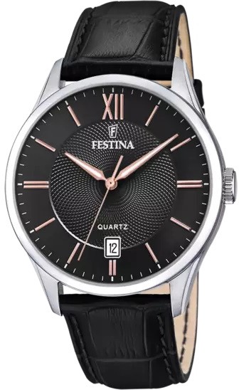 Festina Classics 20426/6 to elegancki męski zegarek na baterię na czarnym skórzanym pasku ze sprzączką. Koperta ze stali nierdzewnej ma średnicę 43 milimetrów. Czarna tarcza o promienistej strukturze i datowniku na godzinie szóstej jest chroniona wytrzymałym szkłem mineralnym. Wskazówki mają powłokę luminescencyjną, która po naświetleniu ułatwia czytanie w słabych warunkach oświetleniowych. Za ruch zegarka odpowiada mechanizm kwarcowy Miyota 2415 z dokładnością ±20 sekund na miesiąc. Dzięki wodoodporności 5 ATM zegarek jest odporny na zachlapania i zachlapania i opady.