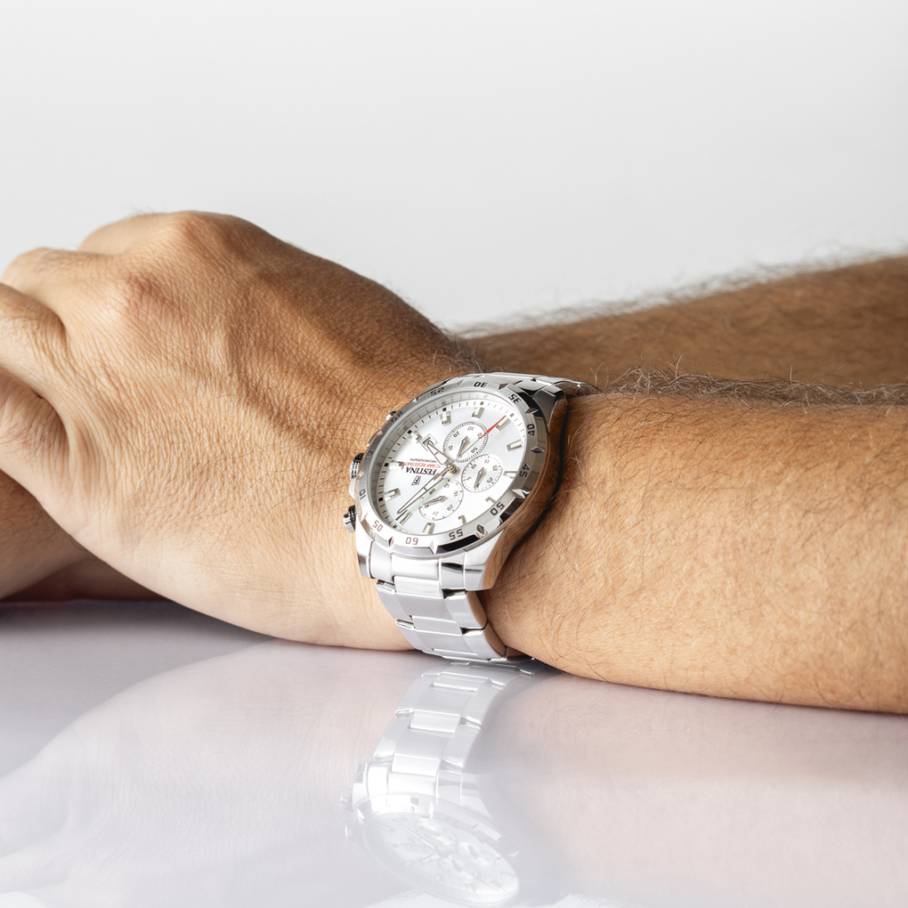 Festina Timeless Chronograph 20463/1 to męski sportowy zegarek na baterię na stalowej bransolecie ze składanym zapięciem. Koperta ze stali nierdzewnej ma średnicę 45,05 milimetra i bezel ze skalą minutową. Srebrna tarcza z datą, stoperem i wskaźnikiem czasu w formacie 24-godzinnym jest chroniona szkłem mineralnym. Wskazówki i indeksy posiadają powłokę luminescencyjną, która po podświetleniu ułatwia czytelność w słabych warunkach oświetleniowych. Zegarek napędzany jest mechanizmem kwarcowym Miyota JS15 z dokładnością ±20 sekund na miesiąc. Dzięki wodoodporności 10 ATM zegarek nadaje się do pływania i snorkelingu.