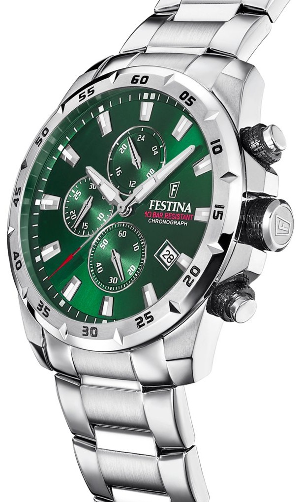 Festina Timeless Chronograph 20463/3 to męski sportowy zegarek na baterię na stalowej bransolecie ze składanym zapięciem. Koperta ze stali nierdzewnej ma średnicę 45,05 milimetra i bezel ze skalą minutową. Zielona tarcza ze szlifem słonecznym, datą, stoperem i wskaźnikiem czasu w formacie 24-godzinnym jest chroniona szkłem mineralnym. Wskazówki i indeksy posiadają powłokę luminescencyjną, która po podświetleniu ułatwia czytelność w słabych warunkach oświetleniowych. Zegarek napędzany jest mechanizmem kwarcowym Miyota JS15 z dokładnością ±20 sekund na miesiąc. Dzięki wodoodporności 10 ATM zegarek nadaje się do pływania i snorkelingu.