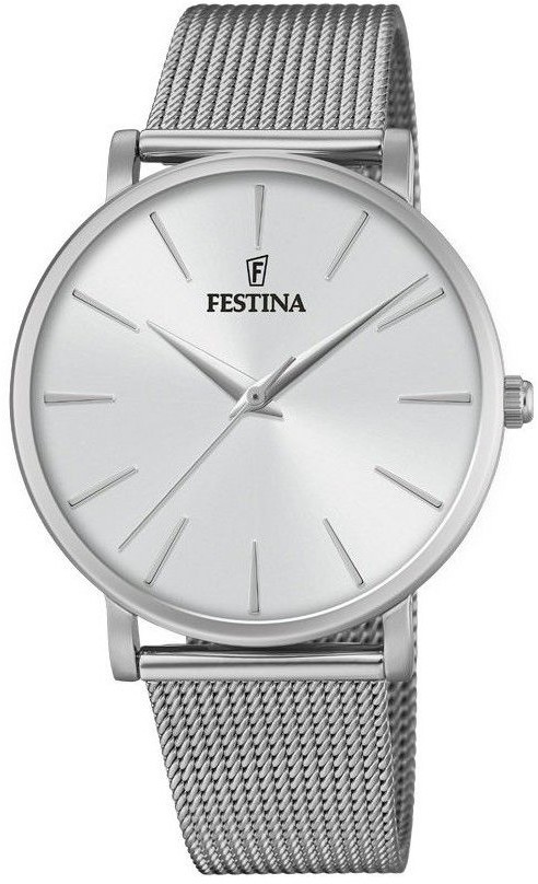 Festina Boyfriend Collection 20475/1 to elegancki damski zegarek kwarcowy ze stalowym mechanizmem mediolańskim. Srebrną tarczę ze szlifem słonecznym chroni wytrzymały szkieł mineralny i stalowa koperta średnicę 38 milimetrów. Zegarek zasilany jest mechanizmem kwarcowym Miyota Gl30. Dzięki wodoszczelności 3 ATM zegarek jest odporny na zachlapania i mycie rąk.