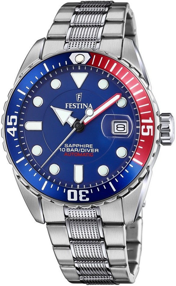 Festina Automatic 20480/1 to klasyczny męski zegarek mechaniczny na stalowej bransolecie ze składanym zapięciem. Koperta ze stali nierdzewnej ma średnicę 41 milimetrów i czerwono-niebieską bezel ze skalą minutową. Niebieską tarczę chroni szafirowe szkłoszkło ze szkłem powiększającym nad datownikiem. Wskazówki i indeksy posiadają powłokę luminescencyjną, która po podświetleniu ułatwia czytelność w słabych warunkach oświetleniowych. Zegarek napędzany jest mechanizmem mechanicznym Miyota 8215 z naciągiem automatycznym i rezerwą chodu sięgającą 42 godzin. Dzięki wodoodporności 10 ATM zegarek jest odpowiednim wyborem do pływania i snorkelingu.
