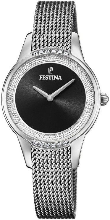 Festina Mademoiselle 20494/3 to damski zegarek na baterie na stalowej bransolecie mediolańskiej z przesuwanym zapięciem. Koperta ze stali nierdzewnej ma średnicę 30,2 milimetra i bezel ozdobioną przezroczystymi cyrkoniami. Czarna tarcza ze szczotkowanym słońcem jest chroniona trwałym szkłem mineralnym. Zegarek napędzany jest mechanizmem kwarcowym Miyota GL20 z dokładnością ±20 sekund na miesiąc. Dzięki wodoodporności 5 ATM zegarek jest odporny na zachlapania i zachlapania i opady.
