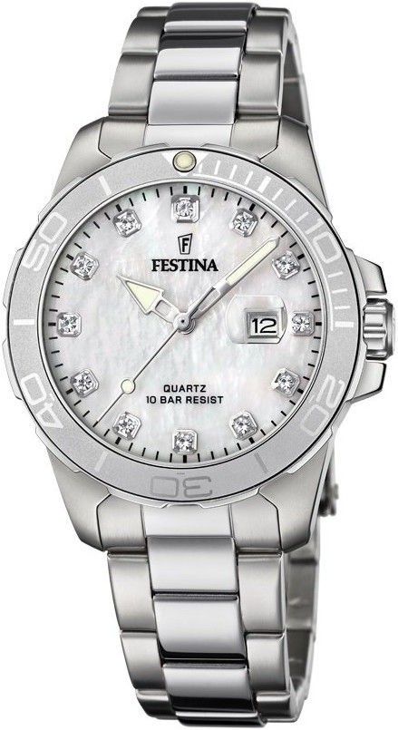 Festina Boyfriend Collection 20503/1 to damski zegarek kwarcowy o klasycznym designie na stalowej bransolecie ze składanym zapięciem. Tarcza z masy perłowej ze szkłem powiększającym nad datownikiem i 12 przezroczystymi cyrkoniami jest chroniona wytrzymałym szkłem mineralnym i stalową kopertą średnicę 34,5 milimetra, która posiada jednokierunkowo obracający się bezel . Wygodną czytelność w ciemności zapewniają wskazówki wyposażone w luminescencję. Zegarek zasilany jest mechanizmem bateryjnymMiyota Gl13. Dzięki wodoszczelności 10 ATM zegarek nadaje się do pływania i snorkelingu.