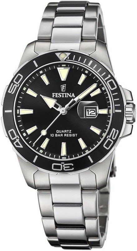 Festina Boyfriend Collection 20503/4 to damski zegarek kwarcowy o klasycznym designie na stalowej bransolecie ze składanym zapięciem. Czarna tarcza ze szkłem powiększającym nad datownikiem jest chroniona wytrzymałym szkłem mineralnym i stalową kopertą średnicę 34,5 milimetra, która posiada jednokierunkowo obracający się bezel. Wygodną czytelność w ciemności zapewniają wskazówki i indeksy wyposażone w luminescencję. Zegarek zasilany jest mechanizmem bateryjnymMiyota Gl13. Dzięki wodoszczelności 10 ATM zegarek nadaje się do pływania i snorkelingu.