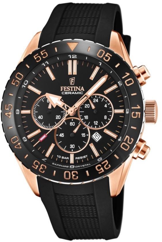 Festina Ceramic 20516/2 to męski sportowy zegarek kwarcowy na czarnym silikonowym pasku. Koperta ze stali nierdzewnej PVD w kolorze różowego złota ma średnicę 44 milimetrów, ceramiczny bezel ze skalą minutową i wraz z przyciskami stopera, koronką i elementami na ramce pasuje kolorystycznie do wskazówek, indeksów i ramki pomocniczej tarczy na czarna tarcza chroniona wytrzymałymszkłem szafirowym. Zastosowane indeksy oraz wskazówki posiadają powłokę luminescencyjną, która po naświetleniu ułatwia odczyt w warunkach słabego oświetlenia. Napęd zapewnia mechanizm kwarcowy Miyota 0S20 z niecentryczną wskazówką sekundową na godzinie 6, wskaźnikiem czasu w formacie 24-godzinnym na godzinie 3 i licznikiem minut stopera na godzinie 9. Jest też okienko daty. Wodoodporność zegarka wynosi 10 ATM i dlatego nadaje się do pływania i snorkelingu.