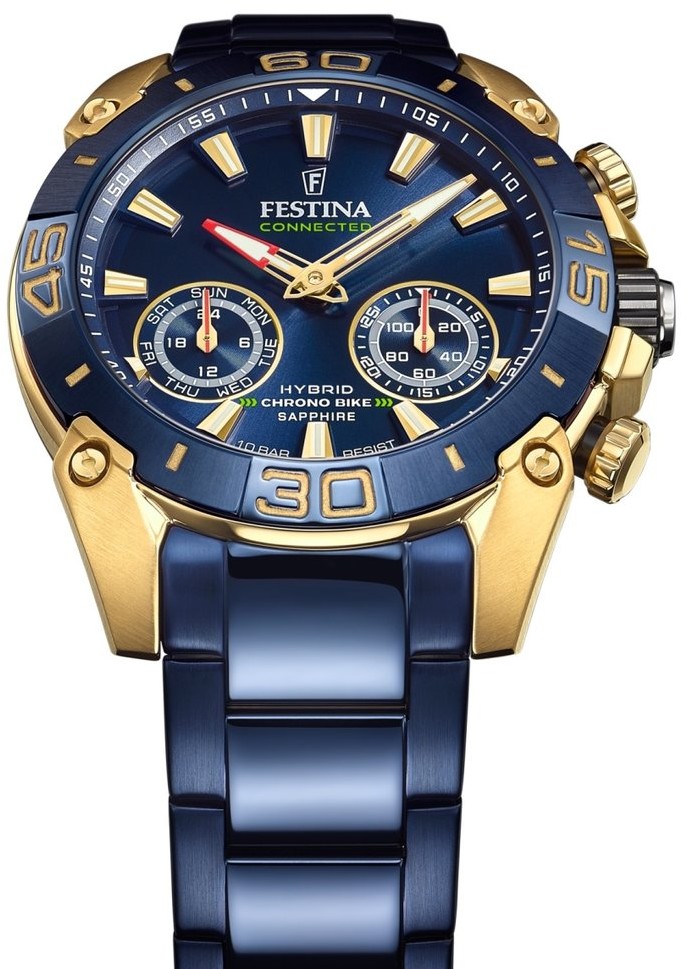 Festina Chrono Bike Connected 20547/1 to męski inteligentny sportowy zegarek kwarcowy na metalowej bransolecie z niebieskim wykończeniem PVD, będący połączeniem wyrafinowanej estetyki i zaawansowanej funkcjonalności. Koperta ze stali nierdzewnej w kolorze złotym ma średnicę 45,5 milimetra i bezel ze skalą minutową. Niebieską tarczę chroni trwałe szkło szafirowe. Wodoodporność zegarka wynosi 10 ATM i dlatego nadaje się do pływania i snorkelingu. Zegarek można połączyć ze smartfonem za pomocą aplikacji Festina Connected, która jest dostępna na Androida i iOS. Wyróżniają się tym, że na pierwszy rzut oka nie wyglądają jak zwykły inteligentny zegarek, ale mogą oferować 17 przydatnych funkcji opisanych szczegółowo poniżej. Należą do nich na przykład: Bluetooth, krokomierz, minutnik, stoper, budzik i wiele innych. Bateria ma żywotność ponad dwa lata. Dodatkowo wygląd zegarka można łatwo zmienić dzięki niebieskiemu silikonowemu paskowiz wzorem kamuflażowym, który znajduje się w zestawie.
