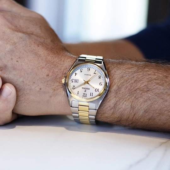 Festina Classics 20554/1 to męski zegarek na baterie w klasycznym stylu na stalowej bransolecie w połączeniu szczotkowania i polerowania ze składanym zapięciem. Centralne części bransoletki, bezel i koronka mają złote wykończenie PVD. Koperta ze stali nierdzewnej ma średnicę 40 milimetrów. Przezroczysta biała tarcza ze szlifem słonecznym i datownik na godzinie trzeciej jest chroniona trwałym szkłem mineralnym. Wskazówki mają powłokę luminescencyjną, która po naświetleniu ułatwia czytanie w słabych warunkach oświetleniowych. Za ruch zegarka odpowiada mechanizm kwarcowy Miyota GM12 z dokładnością ±20 sekund na miesiąc. Dzięki wodoodporności 5 ATM zegarek jest odporny na zachlapania i zachlapania i opady.