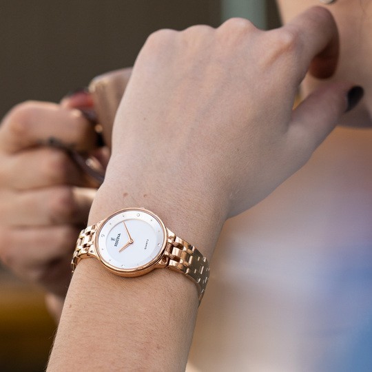 Festina Mademoiselle 20602/1 to damski zegarek na baterie w klasycznym stylu na stalowej bransolecie z wykończeniem PVD w kolorze różowego złota i składanym zapięciem. Koperta ze stali nierdzewnej w tym samym kolorze ma średnicę 30,5 milimetra. Srebrna tarcza ze szlifem słonecznym, ozdobiona przezroczystymi cyrkoniami, jest chroniona wytrzymałym szkłem mineralnym. Zegarek napędzany jest mechanizmem kwarcowym Miyota 2025-H1 z dokładnością ±20 sekund na miesiąc. Dzięki wodoodporności 5 ATM zegarek jest odporny na zachlapania i zachlapania i opady.